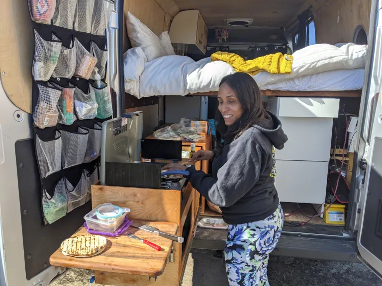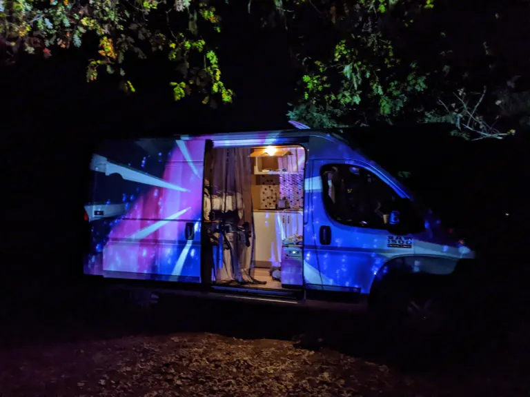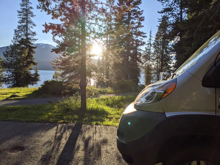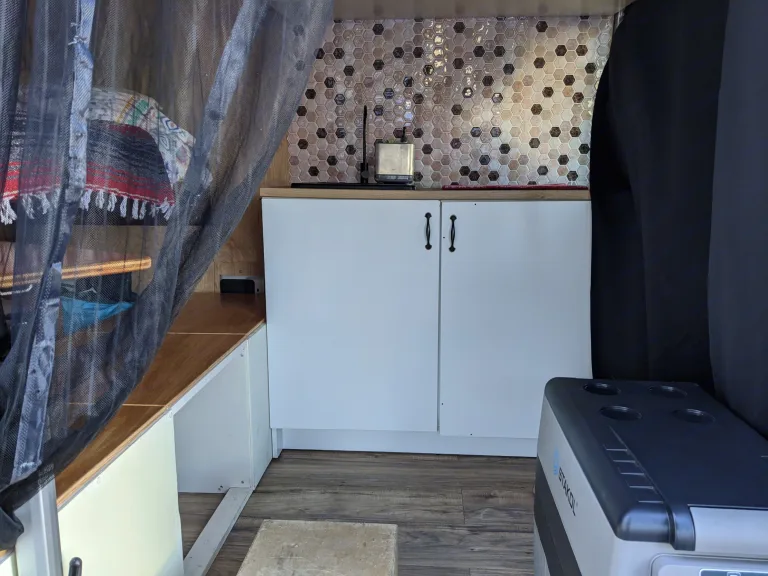 "Ramsey" is a fun little camper van, perfect for two people. There is a slideout kitchen, a 5lbs propane tank in a vented space, seating area, running water, plenty of storage. Comes with two camping chairs and a small coffee table, plates, pans, utensils. Bedding is available on request for a small fee, we encourage you to bring your own if you can. Van is deep cleaned after every trip. The Promaster sits high, with a great view of the road and blind spots. There is no rear view mirror, but you can navigate with back up camera and super wide mirrors that will show cars behind you.