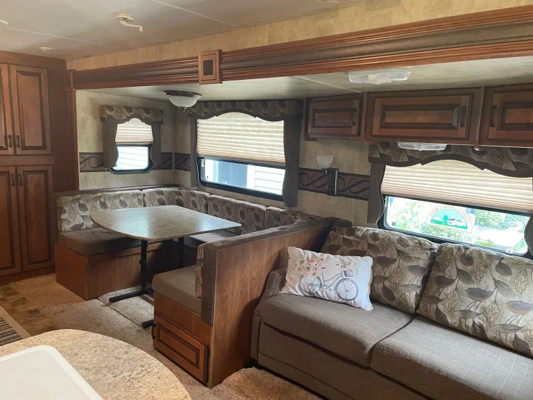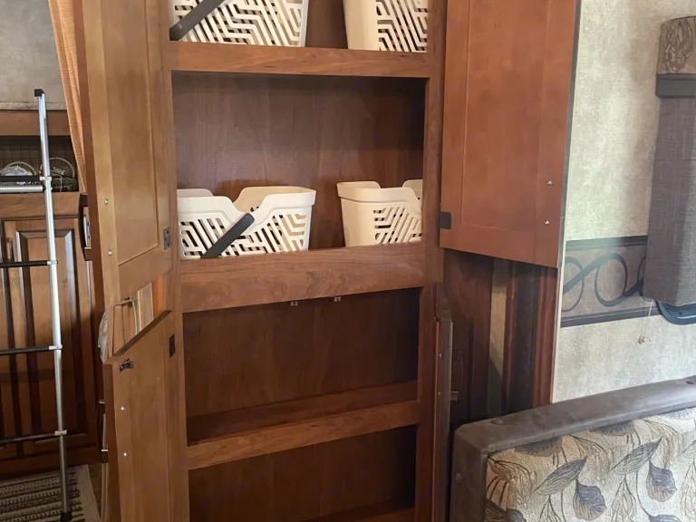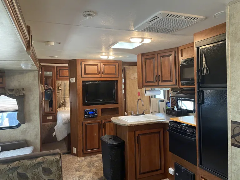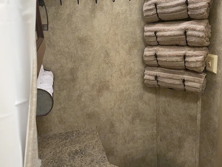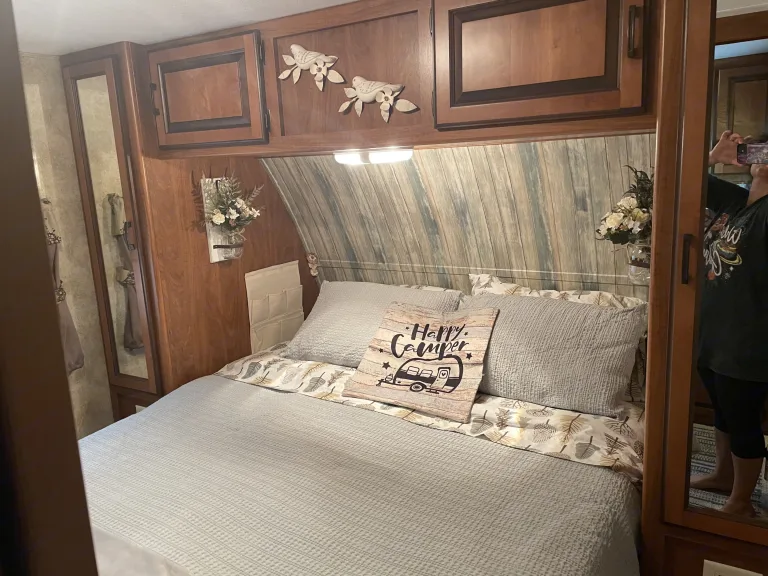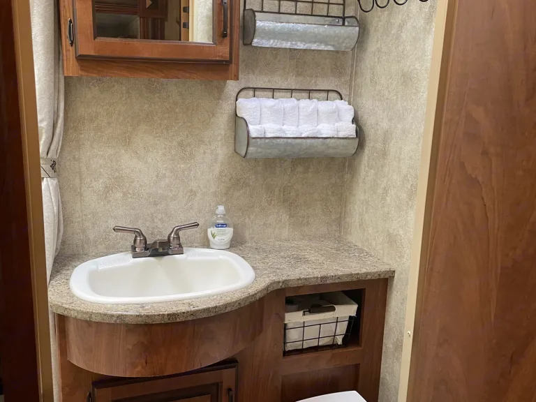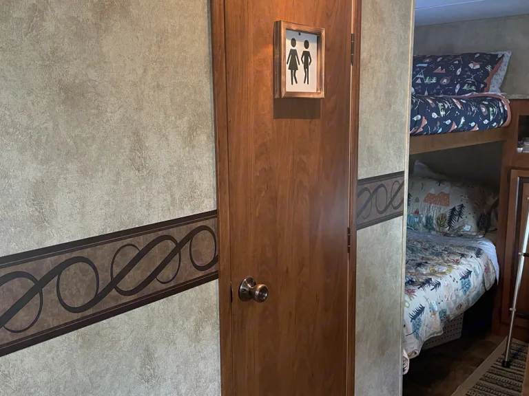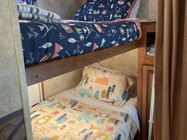 Our 4 to 6 bed bunk house with large slide-out travel trailer has room for the whole family. Master bedroom with queen size bed and private doors. Entertainment center with a TV that swivels between the master and the living area. Living room and kitchen area with large slide-out with the sofa and large u-shaped dinette. Full bathroom with tub shower, toilet and sink. The rear of the camper has large bunk room with 4 bunk beds, with under bed storage or if you need extra beds 2 more beds can be made with a closet.