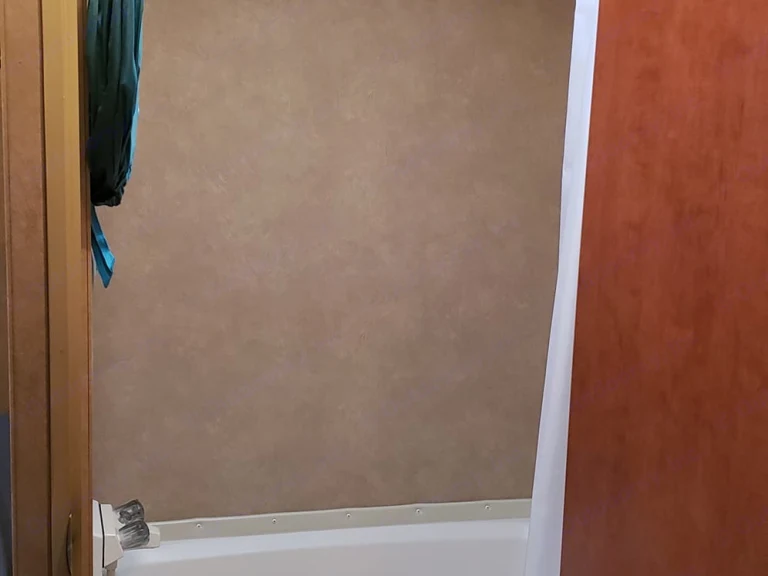 * The Bathroom: Stand up shower / tub, Sink Hot & Cold Water, Fan.