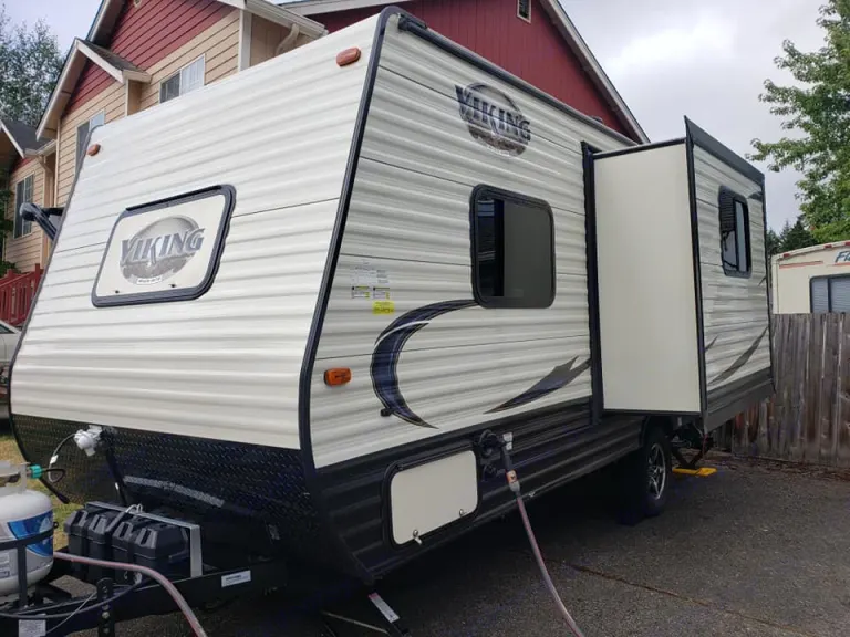 Chillaxing II A Forest River, Viking, 17FQS Ultra Light. 3260 lbs dry weight. As an example, it can be easily towed with a Mid Size SUV. Comes with almost everything you could possibly need for a wonderful camping / road trip!