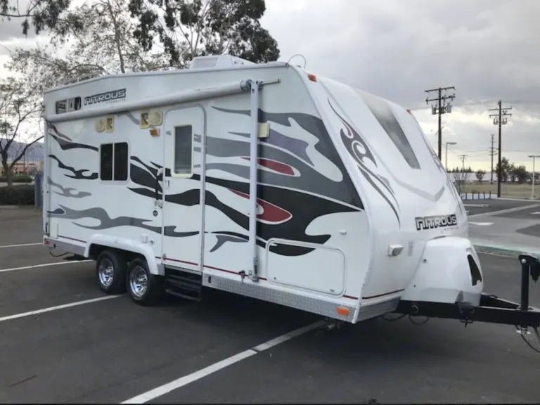 Hit the road in our 2007 Fleetwood Nitrous Hyperlite toy hauler — the perfect adventure rig for the Sierra Nevada, Lake Tahoe, Burning Man, Night in the Country, and everything in between. Based in Reno, you're minutes from some of the best camping in the West.The garage/living area features TWO Queen-size bunk beds - yes, this awesome travel trailer has two queen beds - and plenty of room for your bikes, dirt bikes, ATVs, or Burning Man gear. The front kitchen is fully equipped with a 3-burner stove, oven, microwave, and full-size refrigerator. The full bathroom includes a shower/tub combo so you can clean up after a day on the trails or the Playa.