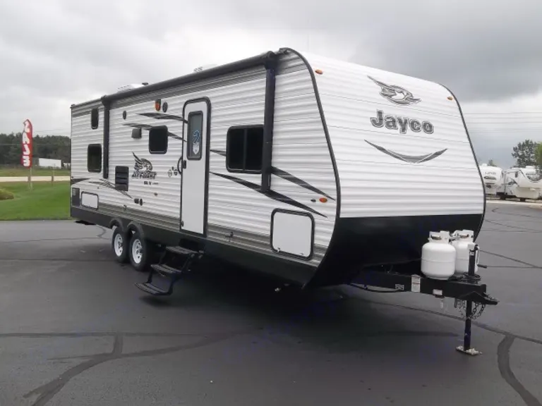 This Jayco Jay Flight SLX is the perfect unit for your larger family, or one that likes to travel with guests! This travel trailer offers one large slide, a rear corner bath, double bed bunks, and so much more!Step inside and notice the entertainment center just off the foot of the queen bed in front. You will find curtains that can be pulled at night for privacy on either side of the entertainment center. For your clothing there are dual wardrobes, and an overhead shelf above the head of the bed for your things.In the main living area you will enjoy ample space for everyone thanks to the large single roadside slide. Within the slide you will find a standard booth dinette and sofa with storage above the sofa side.Cooking will be a breeze with the amenities provided. There is a double sink within the angle counter top to the left of the entry door. Next, a three burner range with overhead microwave oven, and a refrigerator for your perishables. You will also find a pantry cupboard for your dry and canned goods, and overhead cabinets for daily dishes and other kitchen storage needs.In the rear of this model there is sleeping for four with a double bed set of bunks. There is also a curtain that can be pulled for privacy, and the bathroom is located conveniently next door. Here you will find a private tub/shower and toilet, and the sink is located just outside the bathroom door.For your outdoor camping gear you will find ample storage space in the front pass-through compartment. There is also additional storage beneath the bunks along the curbside. You will also appreciate the 16' awning for creating a bit of outdoor living space, plus so much more!