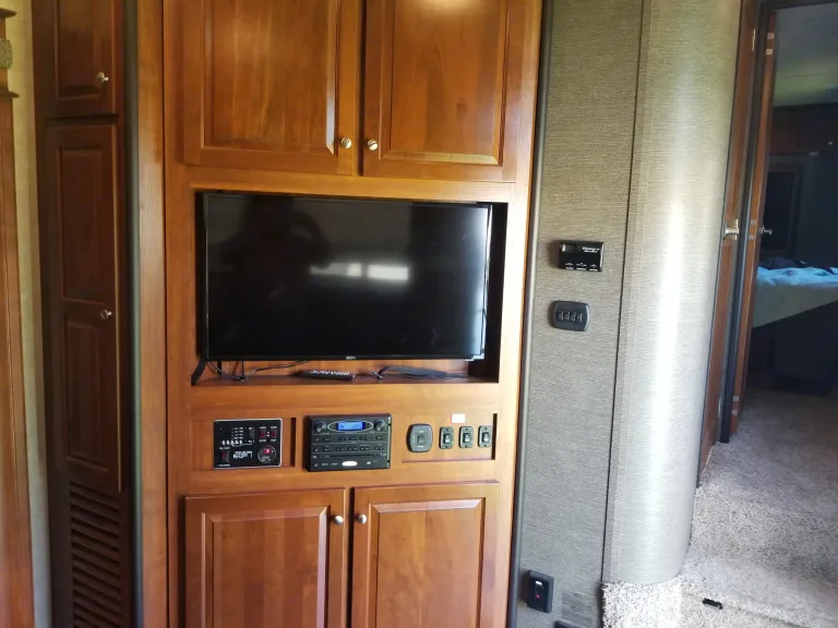 Plenty of room for all. Front separate master bedroom with shower and toilet plenty of cupboard space and a flatscreen t.v. Large living area with leather couches with reclining seats . Kitchen area with large refrigerator stove/oven and microwave. A loft bed area is at one end of room. A large garage with bunk beds that raise and lower with separate toilet and door to the outside. 2 a/c units , generator, awnings and outside speakers. Flat screen from living room can be hooked up outside. The rear ramp on the garage can be used as fenced in patio. Comes with goose neck or regular 5th wheel hook up.