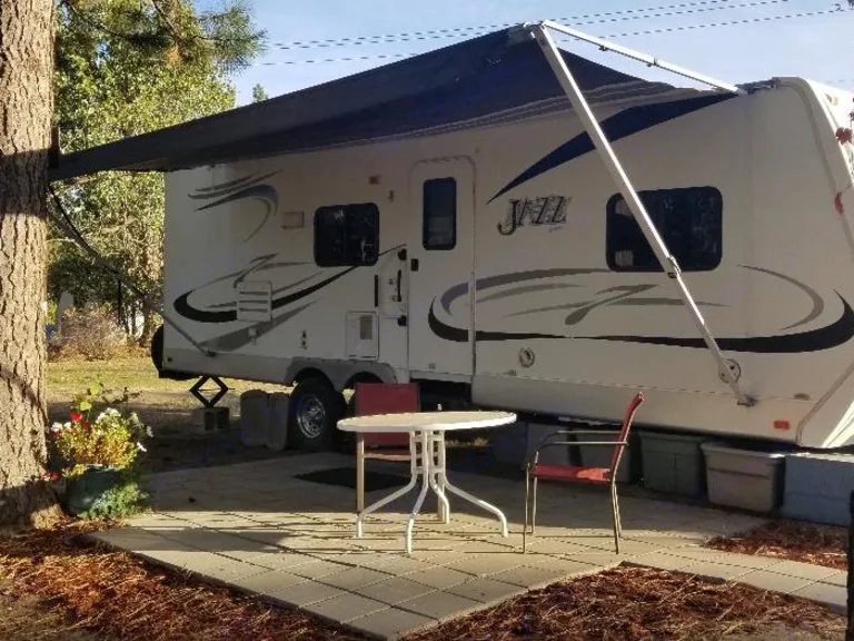 This is a spacious like new 26ft RV that sleeps 4 people with 2 slides. A nice view lot with private patio includes chairs, tables and barbecue at the end of a dead end street. There is a trail across the highway for your bikes or hiking called Fish Lake trail and close to Riverside State Park. This stationary rental is only about 5 minutes from Downtown Spokane, Washington a great place to stay for all of the festivals like Blooms Day, Hoop Fest, Lilac Festival, Torch Light Arm Forces Parade, Pig Out In the Park and the Spokane Interstate Fair. Only 6 miles to Northern Quest Casino for concerts and other entertainment. Silverwood Amusement Park, the mountains, lots of local lakes, golf courses, wine tours, or your favorite destination. This RV has a brand new full size queen size bed 74 x 80 behind sliding glass mirrored doors, a fold down couch and a dinette that can also be made into a bed. New flat screen TV's for the bedroom and living room, new stereo with blue tooth includes outdoor and indoor speakers. Your rental also includes Dish Network with 250 channels. Everything that you need for the kitchen including coffee pot and all cooking and eating utensils plus all linens and towels for bedroom and bathroom no extra charges. New 1100 watt microwave, stove, oven, refrigerator AC and Heat.