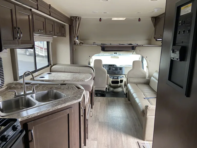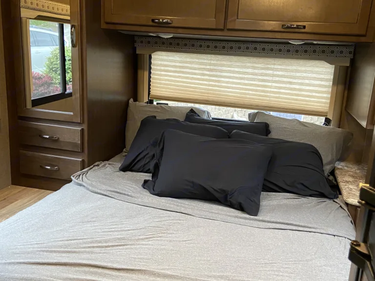 Almost like a brand new RV. You'll wished you rented it longer! Our rig is kept clean and we enjoy the new look. With a queen bed, a double bed over the driver and two sofa that convert to beds the rig establishes a great sleeping. Cups, bowls, plates and silverware is included!