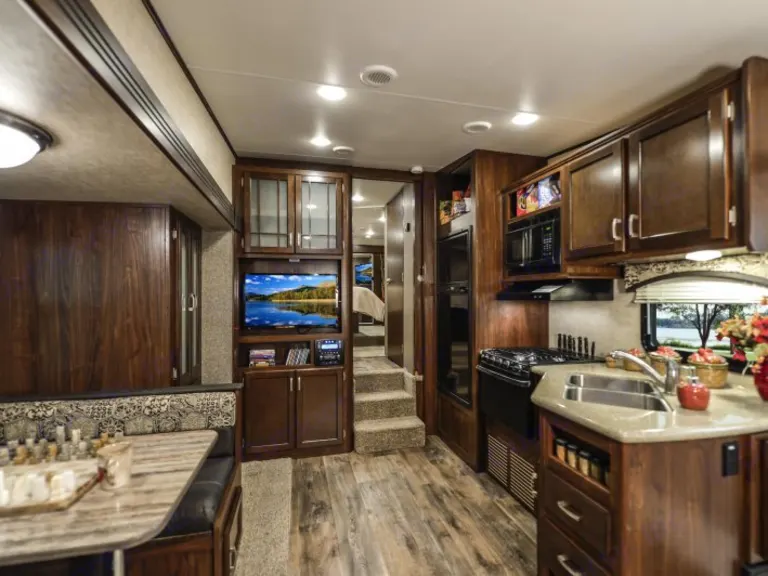 This fifth wheel is light weight and conpact with a/c, heat, radio/CD, two TVs, dual kitchen sink, solid counter top, microwave, three burner stove with oven, queen bed, shower, sink and toilet. There is a couch in the living room that converts to a bed for a child. There is an exterior shower, plenty of basement storage, automatic awning. Two slides and LED Lighting.This camper requires towing with a Pick up. Owner will provide Haul, set up and Haul back for an additional fee and mileage.