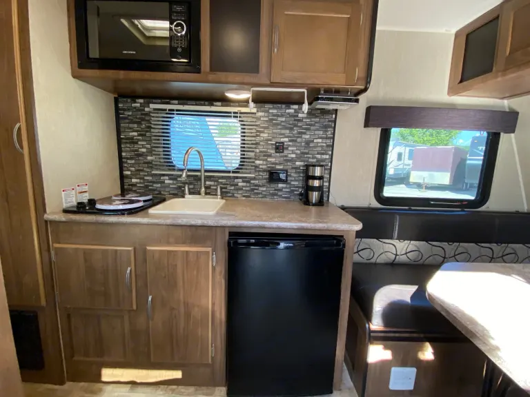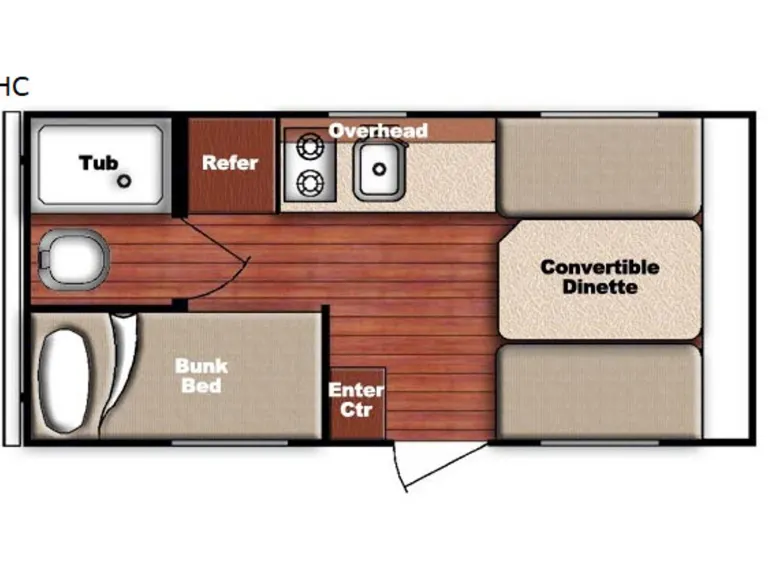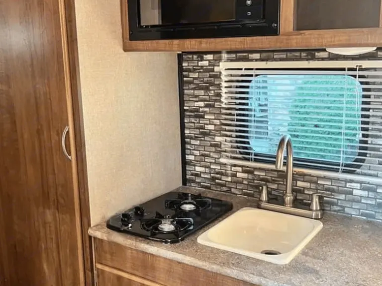 Has a dinette (which converts to a full bed), two bunks (2 adults or 2 children sleeps comfortably.) There is also a full kitchen with a sink, 2-burner gas stove, refrigerator with small freezer, and microwave. She has Utensils, dishes, coffee maker, pots, kitchen towels, coffee mugs, and plates for 4 people. The bathroom features a toilet and a shower with toilet paper, toilet paper holder, broom and , and cleaning supplies.