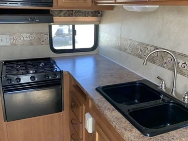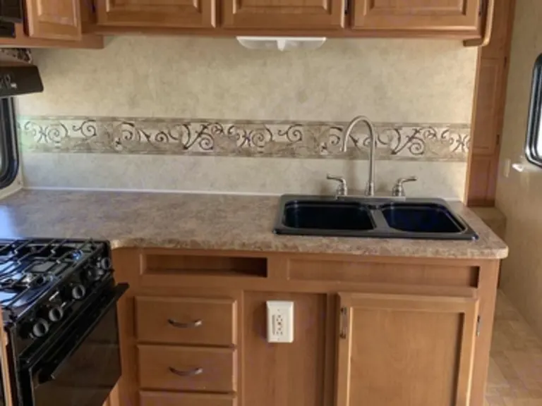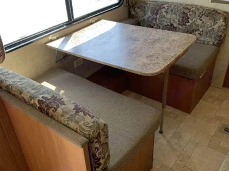 Very family friendly camping trailer that can comfortably sleep 8 with 2 full sized beds, one bunk bed as well as two conversion beds from the sofa and dining table. Spacious kitchen with open counter space for prepping and cooking. Large, double sink offers more space for dishes without feeling crowded. Stove, microwave and oven make cooking easy. Tons of cupboards and storage space for all supplies to stow away. Sofa and dining table layout offers tons of seating and space for hanging out and conversation.