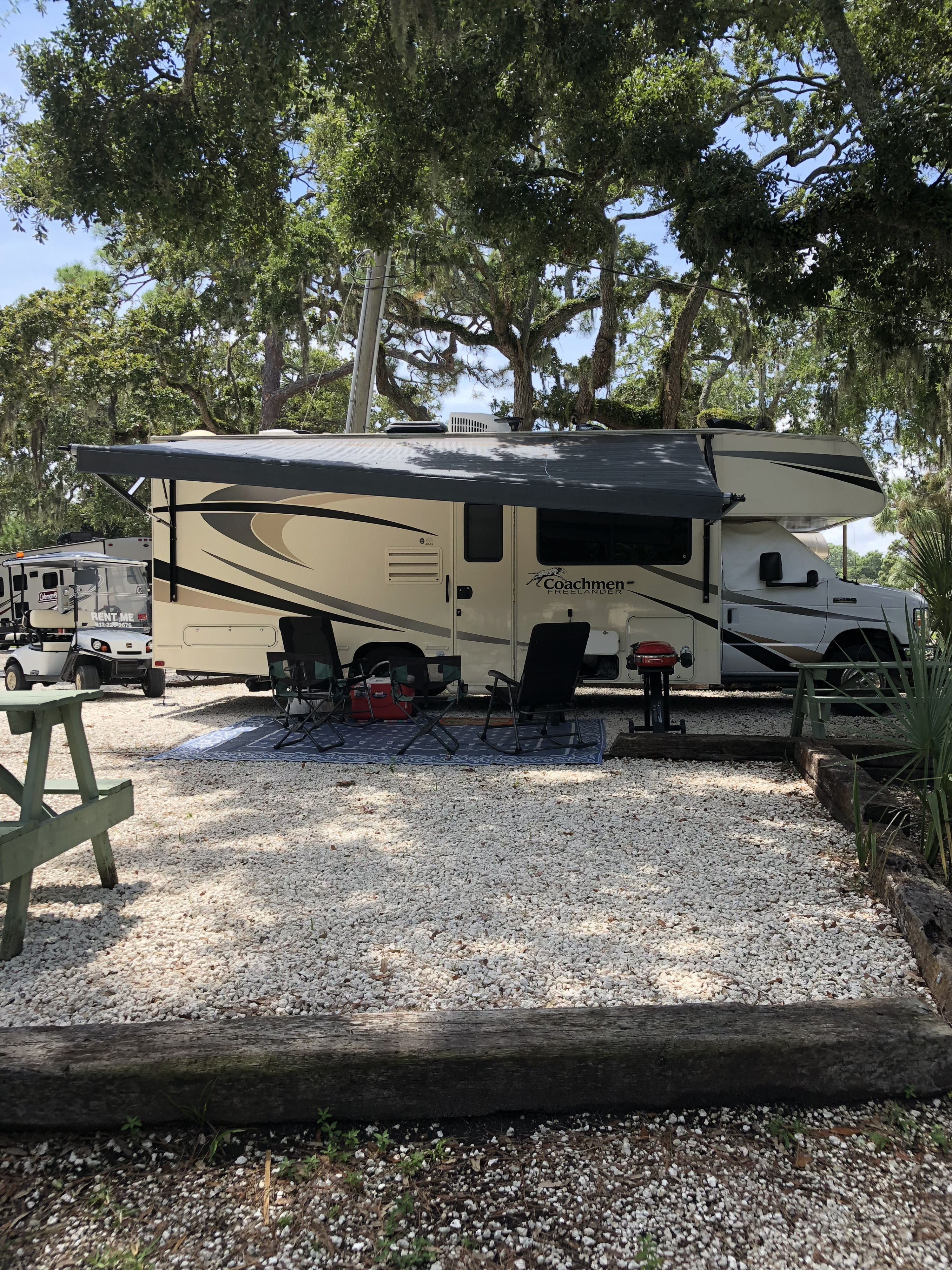 Newer Class C with most bells and whistles. 2 tv's inside, one outside. Sleeps 6 comfortably, and has a horseshoe shaped booth. Very easy to set up and start your vacation. Day/night privacy shades, and a wrap/around windshield cover. Bed linens and Beach towels provided. Broom and dust pan in outside storage. A/C, 2 power fans, 2 CD/DVD players, and an antenna for tv reception and Wifi. Stove and oven, microwave, coffee maker, toaster, all dishes, cookware and flatware provided as well as food storage dishes. Rug for outside "patio" space, 2 chairs, and cargo carrier on the rear for additional gear. A Coleman grill with 2 cans of propane is also available. A notebook with operating instructions also in coach.