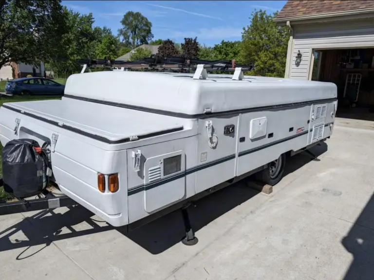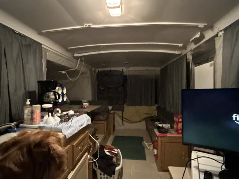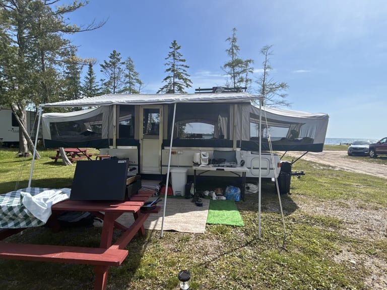 Sleeps 6-8 people with two king beds, dinette conversion and sofa bed.There is enough room for a pack and play due to the slide out.Comes with awning and screened in room for additional footprint. *Works great for the rain and bugs!*Heating but no AC, I will provide a fan that works great. The sides are angled, so there is a great cross breeze with the wind.It comes ready to go! Just need your clothes and essentials.What's included• Linens