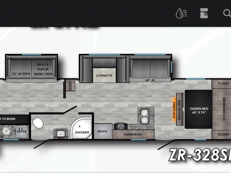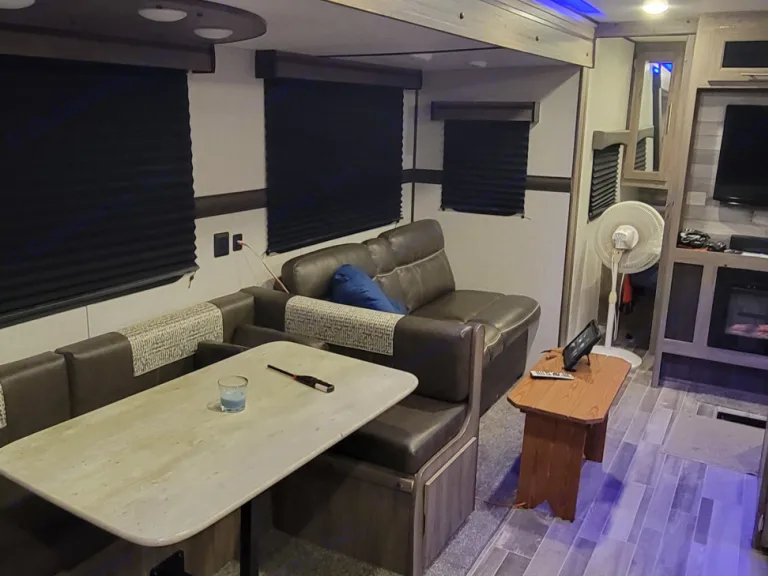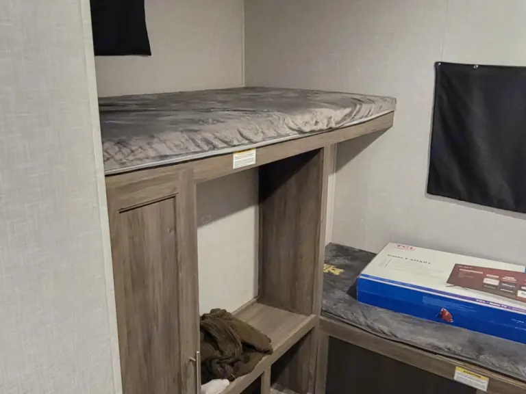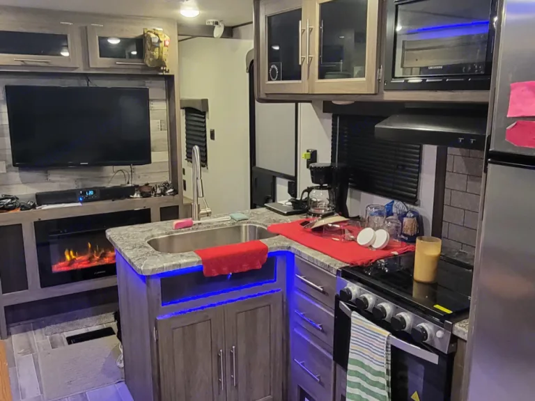Quaint and cozy with a gas fireplace, full indoor kitchen, outdoor kitchen and two slides creating a great space for fun and adventure. Entering into this camper brings immediate hominess and comfort! To boot, the bunkhouse has a TV, a couch that pulls out to a bed and three beds so that all the little ones are taken care of.