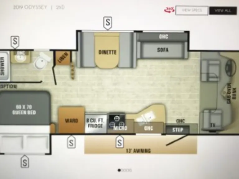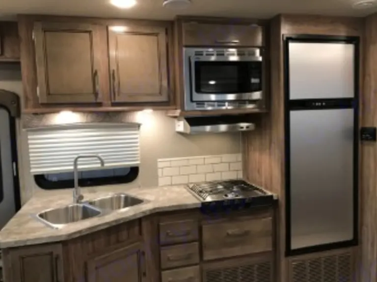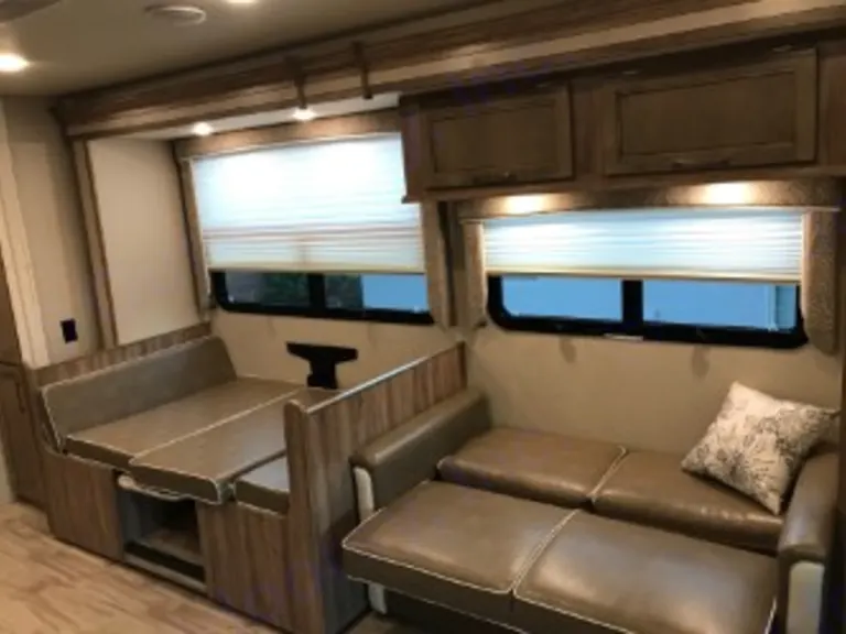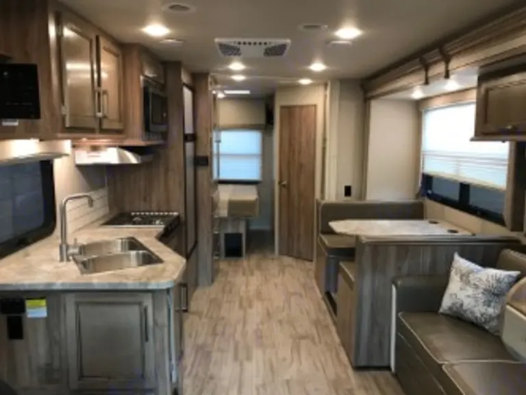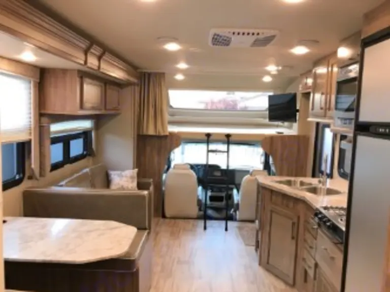 Camp with confidence and comfort with this truly unique Class C motorhome. Features many amenities of a luxury coach. Sleek window in spacious overhead bunk. Comfortably sleeps 5. Two flat screen TVs. Kitchen is fully stocked including convection microwave, 3-burner gas range, dual sink, water filter, and USB outlets. Queen mattress topped with memory foam and offers electrical outlets for each night stand. Thermostat for powerful A/C and heat. Auto stabilizer system for easy set up in camp. Electric awning system with led accents lights. Exterior shower and generator. Upgraded chassis and suspension for a smoother ride. Gas, V-10 engine with towing capacity of 7,500 lbs.Basic kitchen and bathroom cleaning supplies included. Cooking supplies provided-cooking spray, vegetable oil, salt, pepper, garlic salt, onion salt
