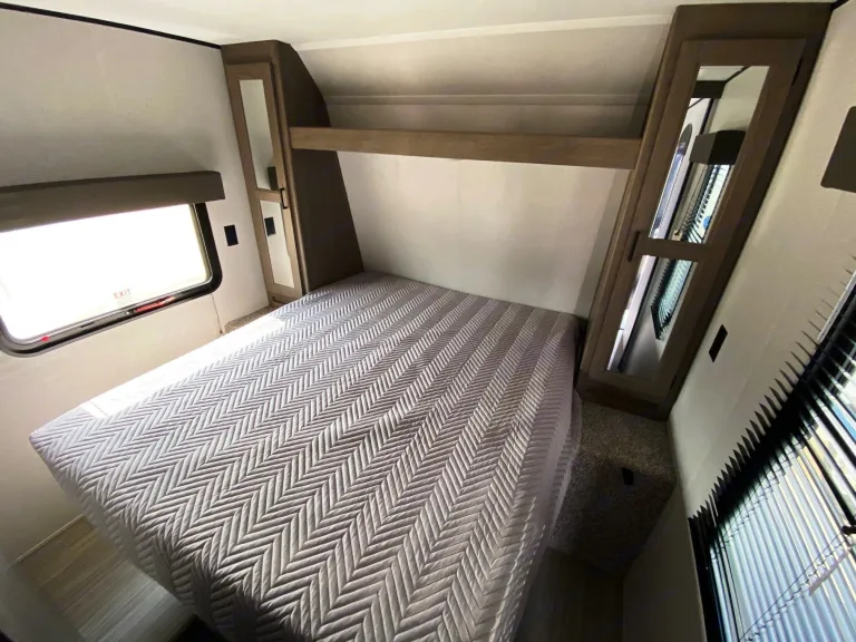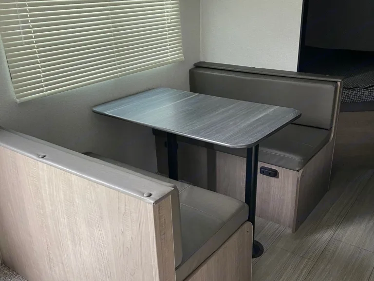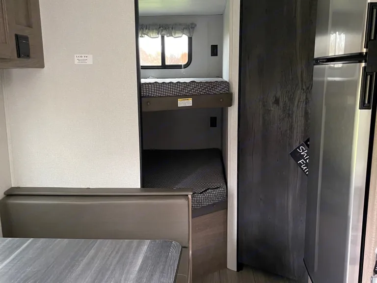 Easy to haul and sleeps 6 comfortably. Its a gem of a camper! This camper has a suite styled room with a queen size bed and plenty of storage options, A dinette table that turns into a bed and a set of bunks that have plenty of space for the kids.