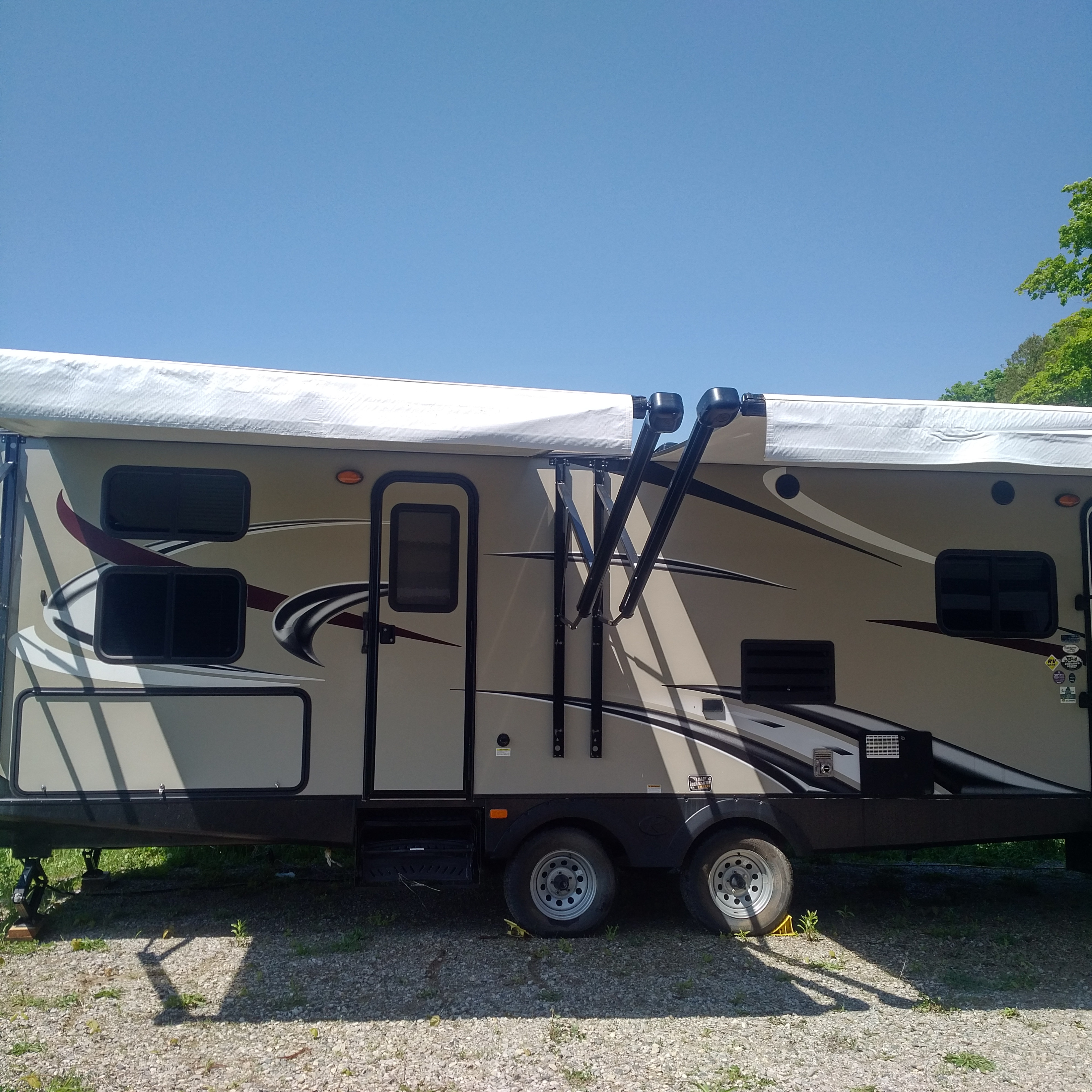 This RV is in excellent clean condition. 2 Tip outs allow for a roomy kitchen, dining, living area. Private master bedroom with full size queen mattress. Bunkbeds and large fold out couch area in the rear separated with a curtain. Outdoor entrance to the bathroom with a shower, tub sink and toilet. Very comfortable and convenient if camping on a site with sewer hook up. Outdoor kitchen with propane supplied within reason. Some supplies included.