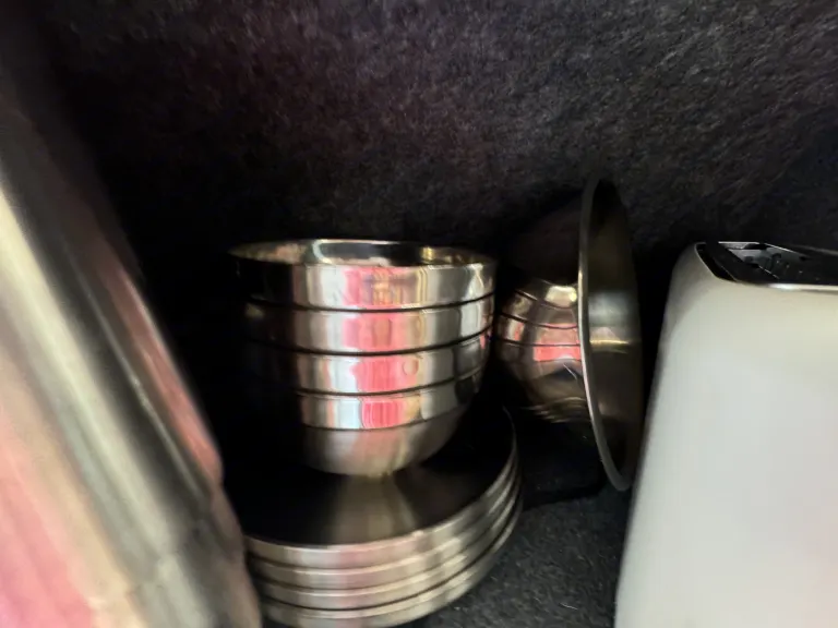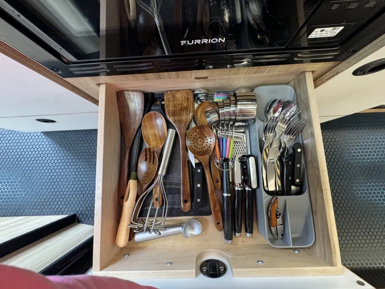 Cook your favorite meals in the kitchen. It has a fridge, induction stove and a convection microwave.
