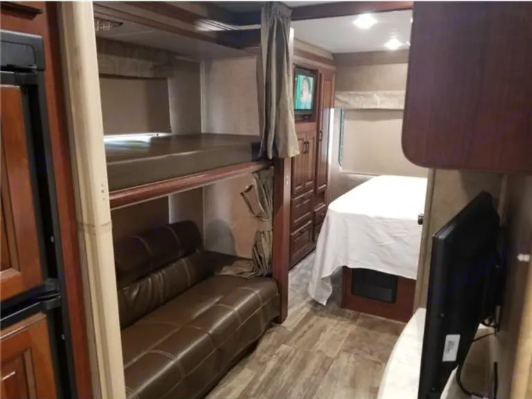 Great RV for a family trip. Queen bed in the back with flat screen TV at Bunk beds, each with a porthole window is coach also has 2 slides, a sofa and dinette that each convert to a bed and an over-cab queen bed. Kitchen has stove, oven and microwave. This RV can sleep 8 comfortably. Outside TV and CD player for your outside entertainment.