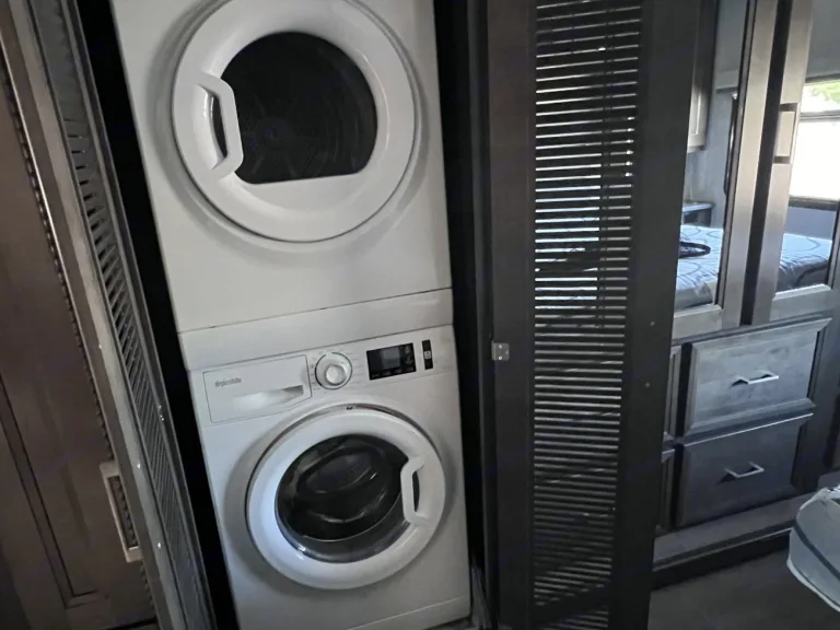 This coach boasts all the storage space you could need, and has full stackable washer/dryer units built in- no more laundromats or RV park laundry room visits!