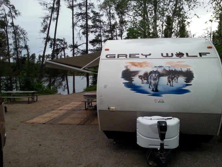 Make your camping experience a memorable one in this spacious family trailer. It has a queen bedroom up front and a 4 bunk bedroom in the back. It has 1 large pullout with a u-shaped dinette and skylight. This unit features 2 televisions, DVD/CD radio, large awning with outdoor carpets, A/C, furnace, BBQ, towels, cutlery, dinnerware, cookware, cleaning supplies and much more. Our trailer is not available for festivals. Delivery and set-up is available at an additional cost. A proper vehicle with at least 10 000 lbs towing capacity and equipped with electronic brake control and tow mirrors are required. No smoking or pets allowed in trailer.