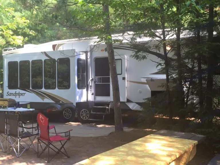 1 bedroom with large Kingsize bed. Beautiful living area with Kitchen Island, 2 leather lazy boy recliners. leather couch with queen pull-out. TV and fire-place. Several large windows that make you feel like your outside even when your enjoying the interior of our RV.
