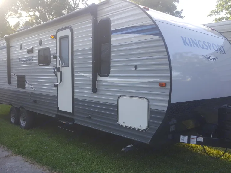 My camper has awning, 4 quad bunk beds, queen bedroom, 1 large slideout. Leather couches. Table and sofa make into bed.