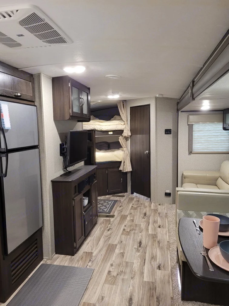 There will be septic fees if there's no sewer hook ups.**Trailer must be returned cleaned to how you got it or a cleaning fee will be applied at the end of your trip**We are dog small friendly-good behaviour is a must-(Dog cleaning fee needs to be added on in add-ons section or it will be added at end of rental and come out of your damage deposit)Sleeps 7 comfortably as it has a Premium Quality queen bed/mattress which is in its own private room, also has double-wide bunks (top bunk has a 250-pound weight limit) so would sleep an adult on each or a couple of kids. The dining table also converts into a bed for 2 if needed, also the couch will pull out into a bed for a child as it's too small for an adult to sleep on. This trailer has Air conditioning for those hot days and a furnace in case it gets chilly.Fridge with freezer and propane stove in the unit, along with shower/bathtub in the bathroom.
