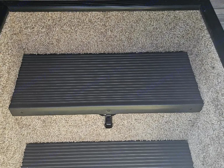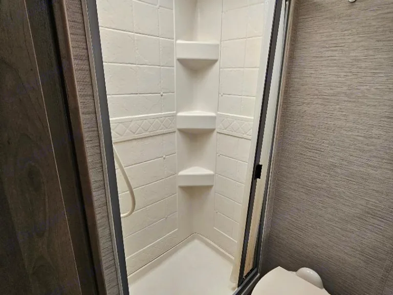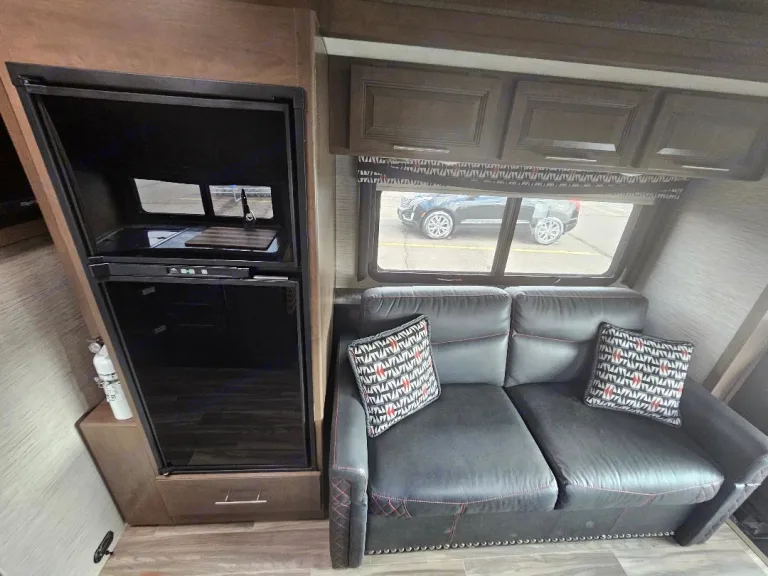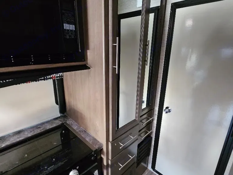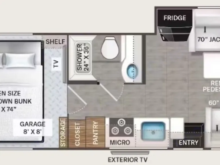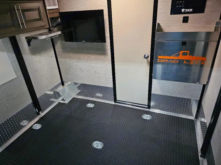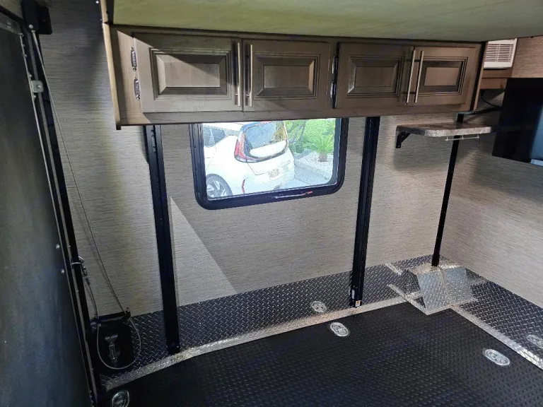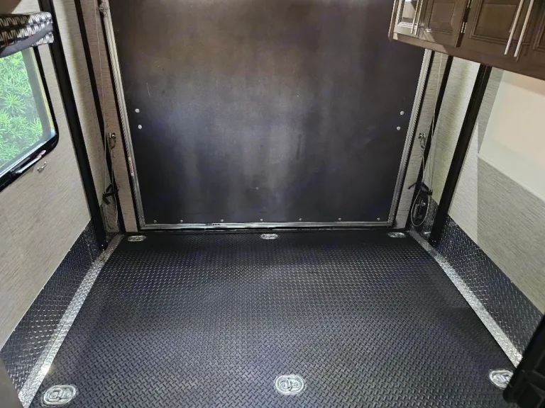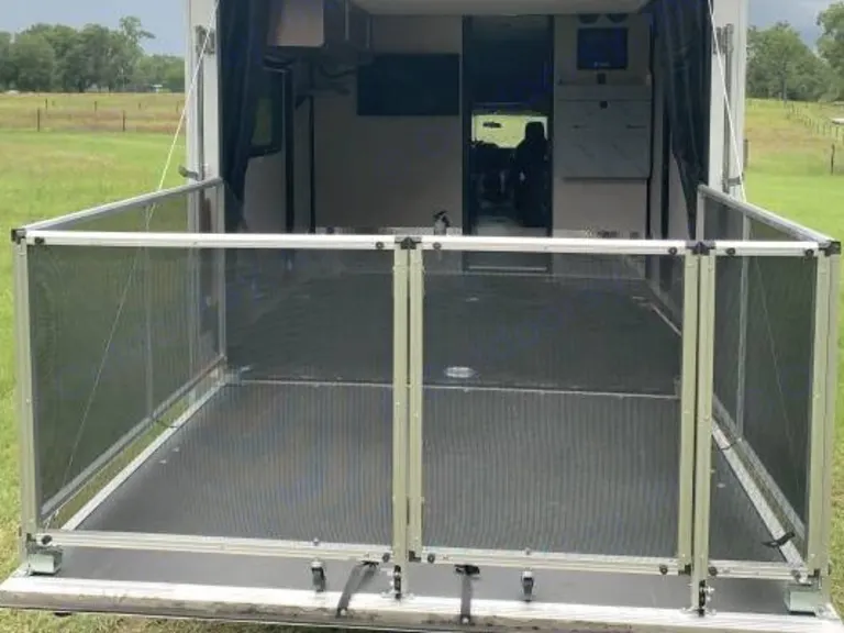 This RV has an 8'x8' toyhauler section at the very back. A rear ramp door that unlocks and lowers to allow you to drive or push items into that part of the RV.
