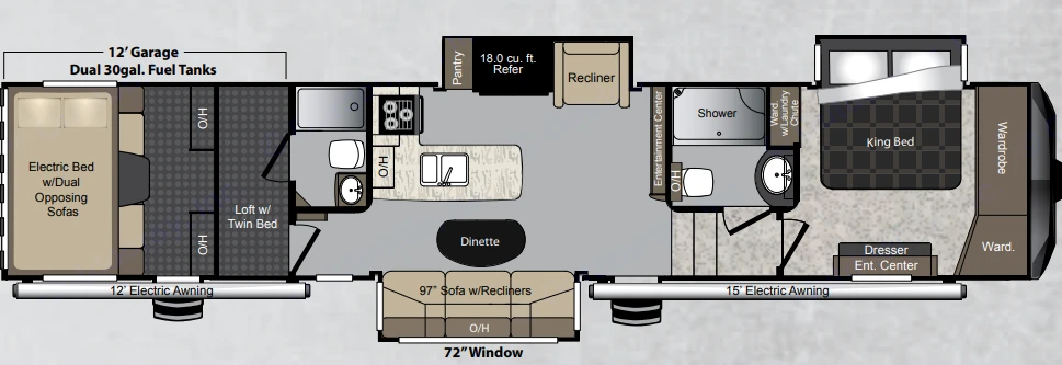 At 40+ feet long it allows for some great features and spacey feel. One of the few RVs with a full 2nd bathroom. Living room area has a nice open feel with opposing couches and TV placement for all to see. TVs and air conditioners in every area if you just want to stay indoors. Two awning on side and one on rear for great shaded times outdoors.Please note that this rental is for delivery only