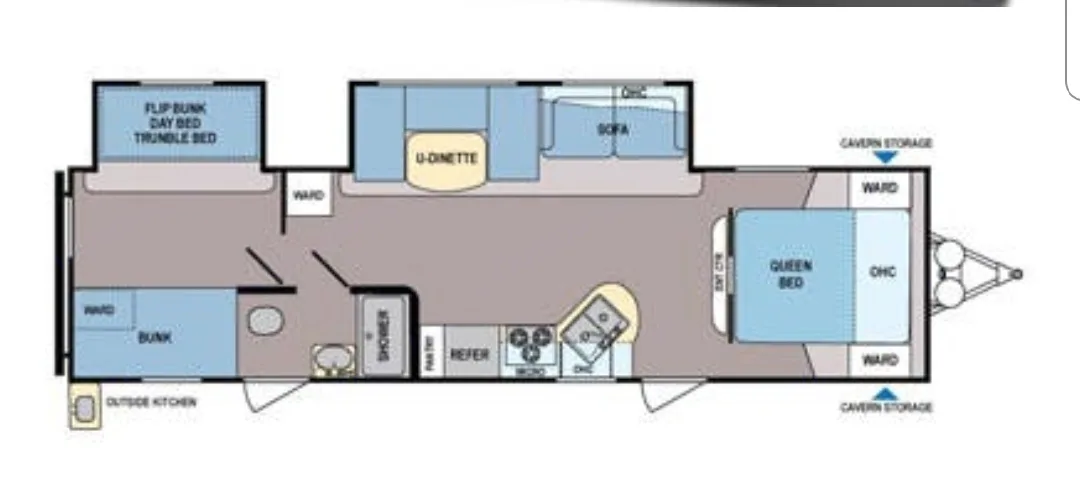 With a 4 bed separate bunkhouse in the back, it's own door to the outside from the bathroom, outdoor kitchen and TV and DVD player...what else could you want for your camping trip. This camper sleeps up to 10 people. The bunkhouse has 4 beds..a queen in front and the couch and U shaped table convert into beds as well. With a full kitchen including a oven and 3 burner stove you got what you need. The outdoor kitchen includes storage as well as a mini fridge and sink. Enjoy the camping life or forget about hotels on your vacation trip.As you walk into the main door, off to the right is the queen master bedroom, with closing doors! You walk into the living area, with a couch that turns into a bed, U shaped dinette table that also transforms into a bed. Off to the left if the kitchen. Nice size fridge and freezer unit, 3 burners and oven along with the double sink and microwave! Go past this area to the bathroom on the left with a tub/shower combo. Past the bathroom you open the door into the 4 bed bunkhouse suite. 3 bunks on one side and another on the top of the closet on the left.Outside enjoy an outdoor kitchen complete with a sink and mini fridge and storage!All you need is your clothes and food. Linens, utensils are supplied!Also, don't have the vehicle to tow it, we can tow it for you, set it up and then pick it back up and tow it away. (Fee applies and pending location)