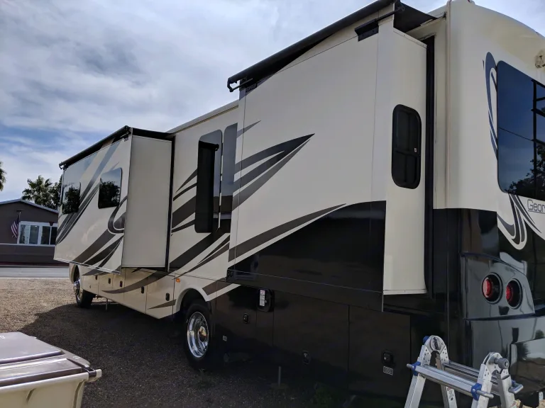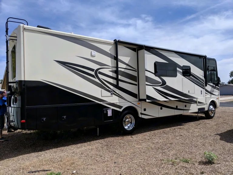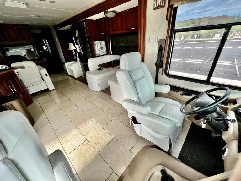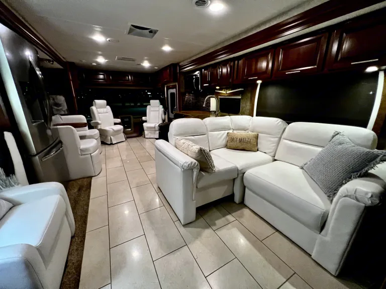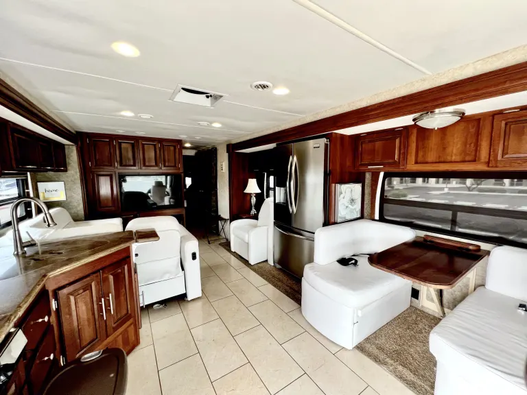 An absolutely beautiful high end coach. With mahogany cabinetry and white ceramic glossy tile. Better than home! This is perfect for entertaining or “roughing” it in style! This resort on wheels sleeps up to 6 people and aims to please. It’s also fairly easy to drive once one gets the handle and feel.Coach/functionality: Three slides, self-stabilization supports, great dry or wet camp, ample storage, large natural gas tank for cooking and heating, back up and side cameras.Living room/Indoor Entertainment: CD and DVD players, 2 television, fire place, L shaped couch and separate reclinerKitchen: Convention oven, 3 burner gas stove, full size residential fridge, eat in kitchen booth table. double sink with retractable spray.Lav: ceramic toilet, full shower, modern above counter glass sink, linensMaster bedroom: RV queen size bed, ample storage, TV, full length mirror, washer/dryer unitOutdoor entertaining: TVs and dvd stereo sound system, retractable awning with outdoor lighting, electric BBQ, 6 zero gravity chairs with 4 side tables, and a folding picknick table.
