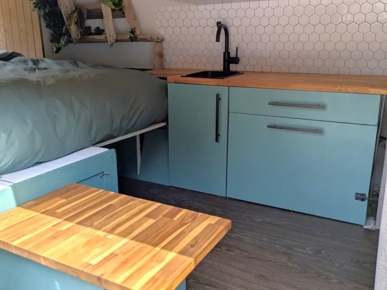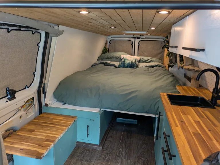 Our lovingly converted camper van is designed to be your own private cabin in the woods (or beach) but on wheels! With a cozy cabin style interior and all the modern amenities, it is ready to take you wherever the road and your heart leads, in comfort.Driving just like a car and just under 20feet long, it’s a surprisingly maneuverable cabin, so even the most inexperienced of adventurers need not worry.Stumbled across an incredible view? Park up your cabin, go for a dip in the water then cook up something tasty on the propane stove. Grab a cold one from the fridge and watch the sun go down with someone special.When you’re ready to turn in for the night, the extra long 6ft 6inch double bed with proper mattress means even the tallest of adventurers will be totally comfortable. Custom-made insulated window covers and four-speed roof fan keeps you cool. In the colder months the foam insulated van and extremely fuel efficient diesel cabin heater, ensure all are toasty warm even when it’s well below freezing outside!Deliberately plain looking from the outside, means you can park it anywhere with no hassle. This home away from home is absolutely perfect even if you’re not experienced in camper van/camping adventures. We certainly aren't but love every minute on the road in this van. So what are you waiting for? Go for it - finally go on that adventure that you’ve been saying you would do for ages.What's included+ Double/Full XL size bed