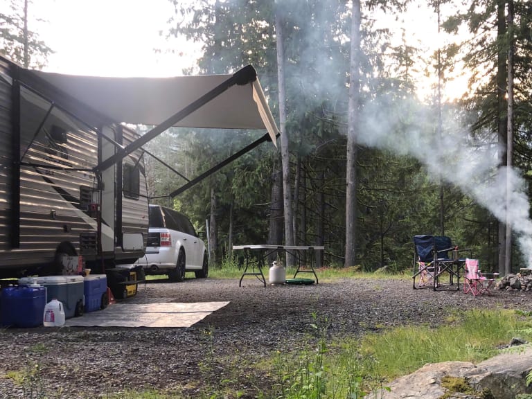 - 2 director camping chairs with pop up table attachedRecommendationsThis trailer is great for times like these. Need to self isolate in your driveway? Do you have family you would like to see but you must maintain social distancing? This trailer has the comforts you need and portability to take and park anywhere! It's also great to take camping or have a staycation at an RV Site. It's a home away from home.Other things to note*Towing Requirements must be met. Hitch with Equalizer bars included. Towing vehicle must meet requirements and have wiring for mandatory brake controller.