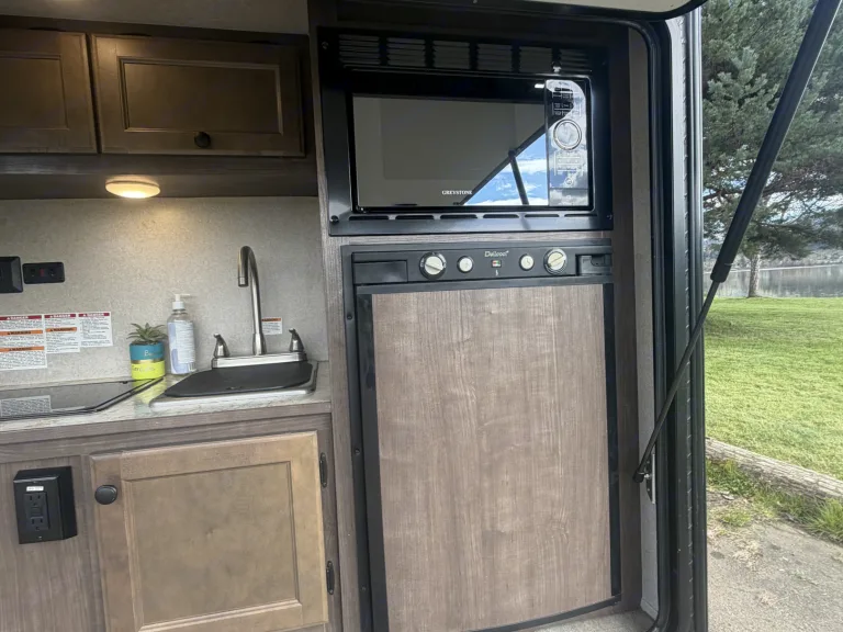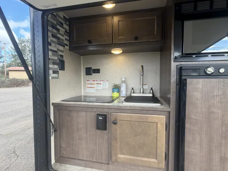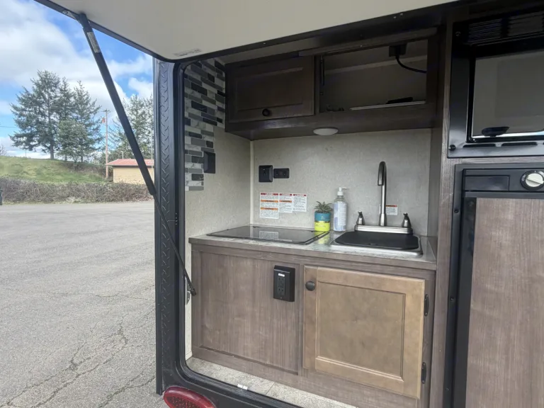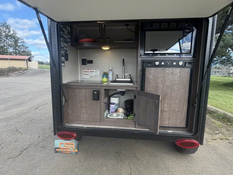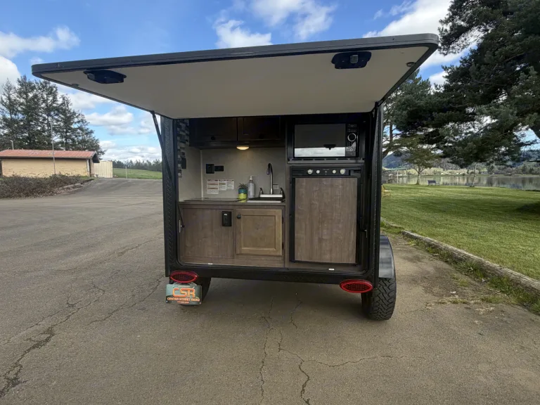 Meet Max, the sportiest addition to the Adventure Bound family. Weighing in at just over 1,300 lbs, Max can be towed by many smaller SUVs, making it the perfect choice for an easy getaway.Key Features include:Off-Road Package: 6" lift, heavy-duty radial tires, and a roof rack for your gear.Outdoor Galley: A rear hatch opens to reveal a full kitchenette with a 2-burner stove, microwave, sink, and refrigerator.Interior Comfort: A sofa that converts into a full-size bed, plus A/C and furnace to keep you comfortable regardless of the "strange" weather outside.Off-Grid Setup: Equipped with a solar kit and 16-gallon fresh water tank