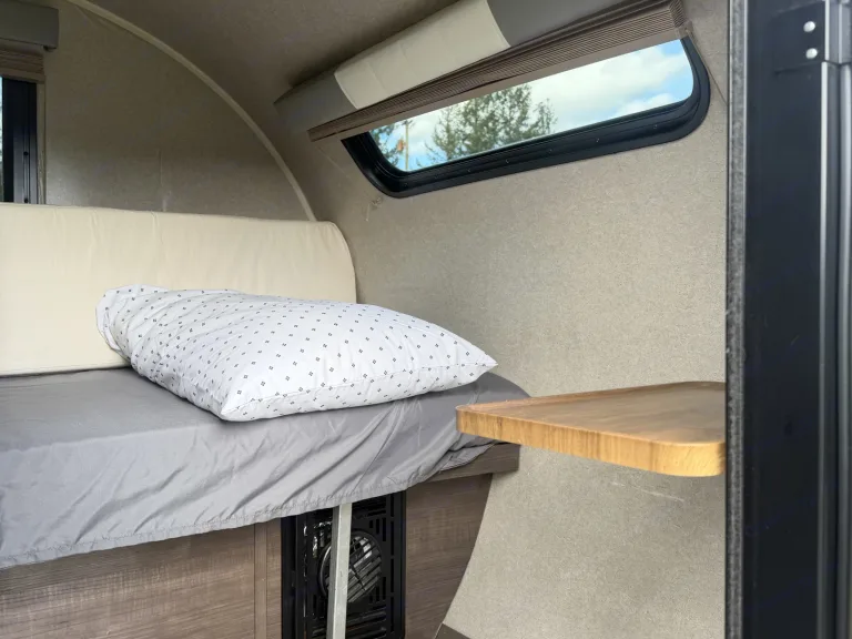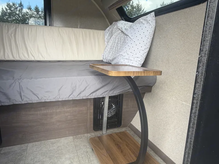 RV rental interior: A cozy bed with a pillow, a window showing trees, and a wooden rolling table on wheels.. Sunset Park RV SunRay 2022