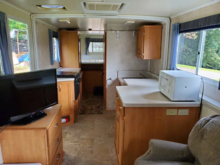 TrailManor 3124KS Travel Trailer w/Rear King Bed, Outside Storage, Wardrobe Below Bed, Tub/Shower, Lavatory, Wardrobe, 3 Burner Propane Range, Electric Oven, TV Cabinet/Dresser, Refrigerator, Hanging Cabinet, 2 Slideout Tables, Front Couch/Bed w/Shelf Above and Much More.Under 5,000lb fully loaded and low-profile when traveling provides great gas mileage on SUVs and trucks with 5,000lb and higher towing capacity. Cooking and eating utensils, King Size bed linens, TV, electric kettle, and microwave included. One pet allowed for $50 one-time fee. Delivery and pickup available within 30-mile radius of Asheville, NC for $250 one-time fee. Additional $200 ($450 total) for delivery/pickup up to 75 miles from Asheville.Additional Rules: