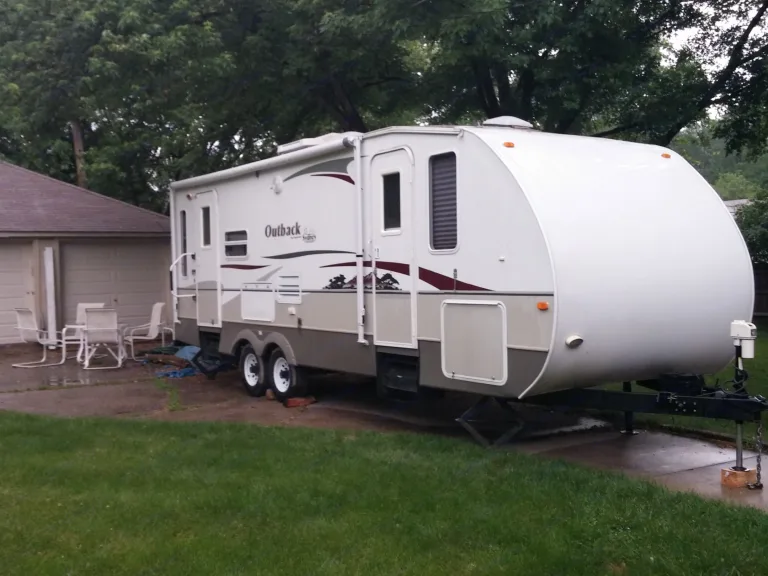 2007 Keystone Outback 27 ft, 1 slide, queen bed, pull out sofa, convertible dinette (sleeps 4 to 6), white interior, shower, bathroom. Great layout, easy leveling, bright interior, awning.* Plates, bowls, silverware and cups for 6