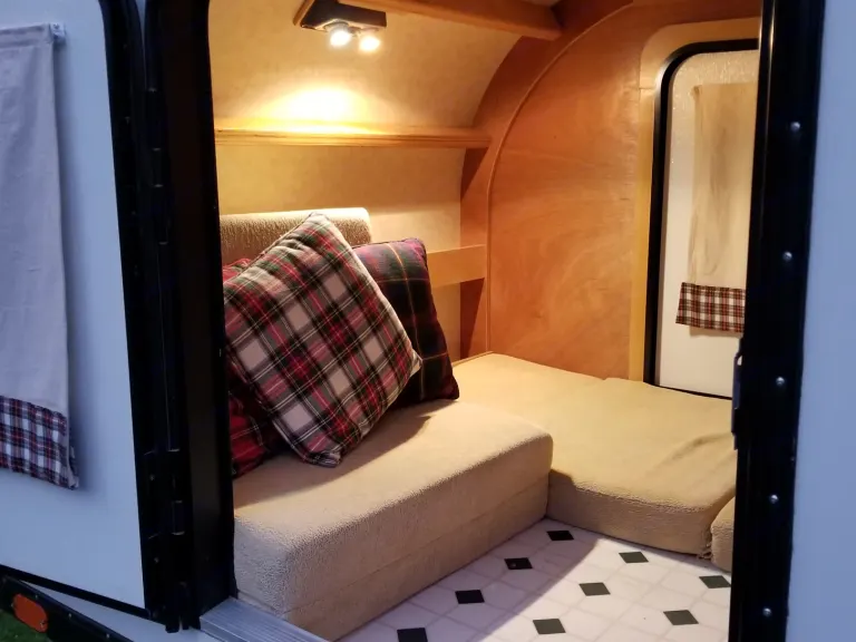 This tear drop is perfect for one or two people for hunting or camping. Two twin memory foam mattresses convert into convenient seating for comfort and shelter from the elements. For one person, one mattress can be used as a chair and the other as a bed. It has doors on both sides for easy entry and exit. Both doors have sliding tinted windows. Handles for the cabinets and drawers are made from antlers, and has exposed wood ceiling beams for a nice rustic feel.Wheel chair accessible. Outside covered kitchen galley comes equipped with camp stove, AC/DC refrigerator, camping pots and pans and utensils, coffee percolator, etc. It has a brand new battery and has been switched to LED lights throughout to extend battery life and reduce heat. Both electric ceramic and propane heaters are provided.The weight of this teardrop is only 1300 lbs, making it easily towable by most minivans and even compact SUVs.