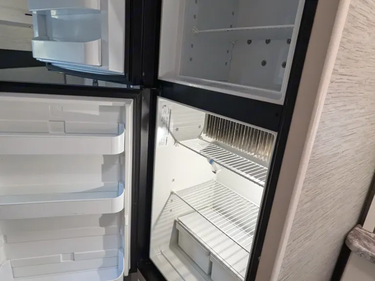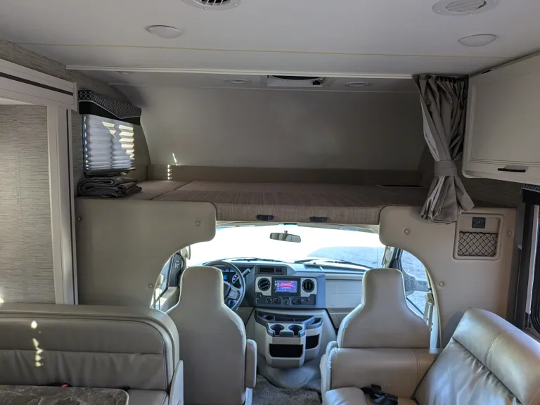 Spacious RV rental interior with a Dometic fridge/freezer, comfy bed, and overhead storage.. Thor Motor Coach Four Winds 2022
