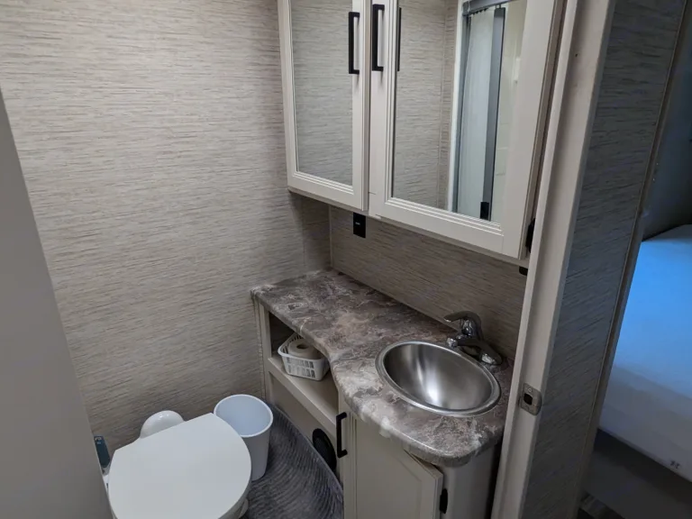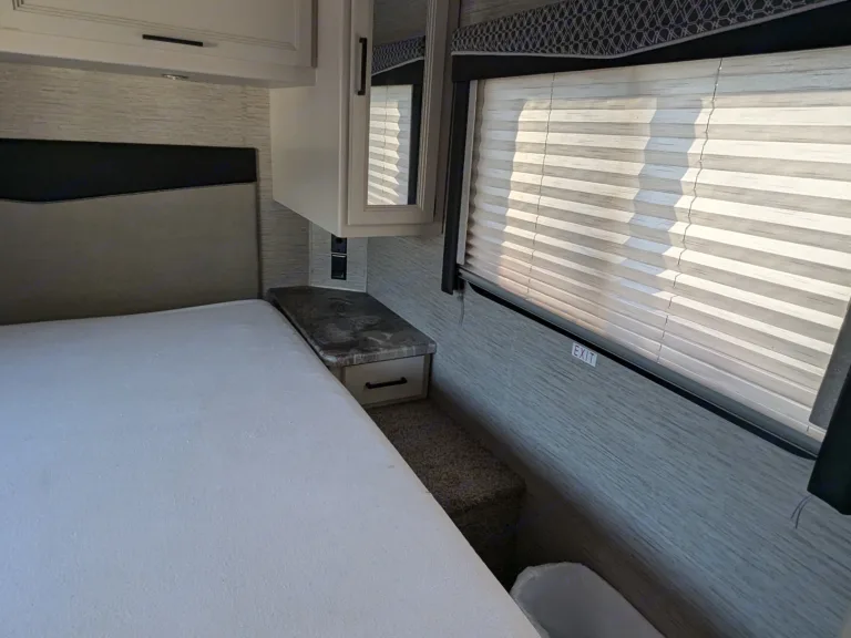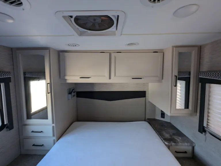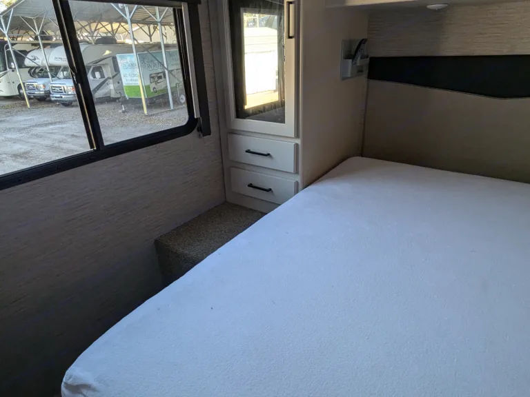 RV rental bedroom interior with a white bed, built-in mirror & cabinets, and a window view of parked RVs.. Thor Motor Coach Four Winds 2022