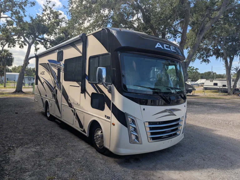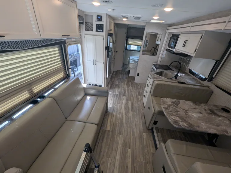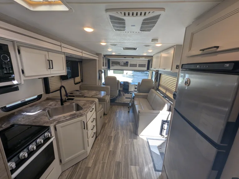 This is an extremely low mile motorhome with all of the features of home. 2 door refrigerator and freezer, power awning, 3 burner stove top, oven, microwave, on board generator, power awning, usb charging ports throughout, outside TV and several more options. Not to mention it is easy to drive.