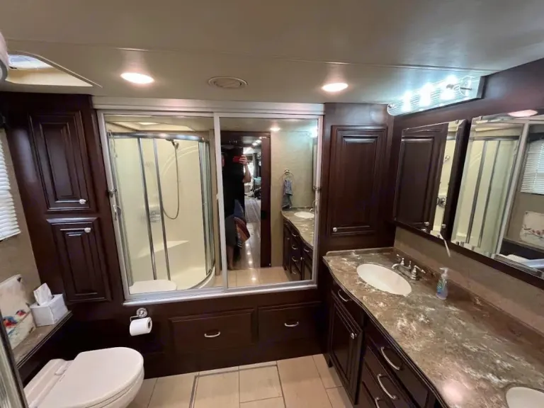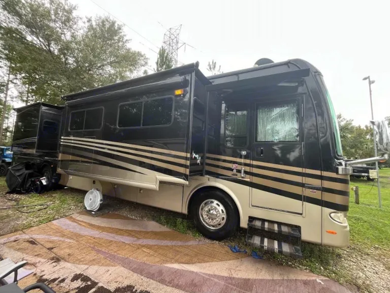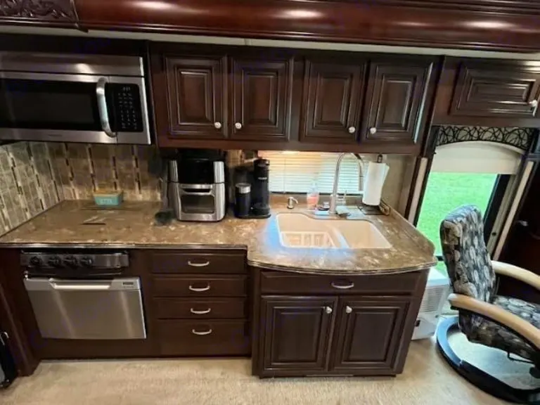 This RV features freight-liner XC chassis with a 450-hp Cummins ISL engine and an Allison 6-speed transmission. Common specs include a length of around 40-45 feet, a fuel capacity of 100 gallons, and holding tanks for fresh (91 gallons), gray (51 gallons), and black (51 gallons) water. The interior often has multiple slideouts and a 7.08 foot interior height.