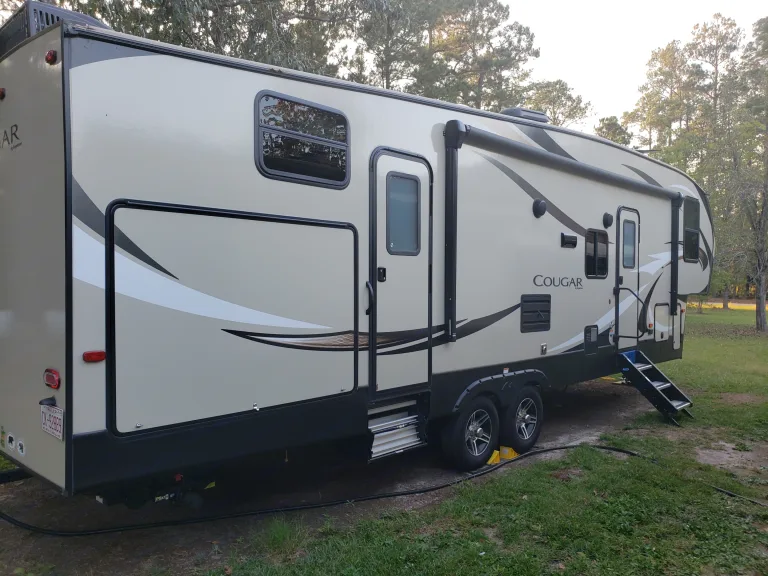 Brand new Cougar fifth wheel. This camper has almost any comfort feature you would need. It has 2 bathrooms, plenty of storage, fireplace, a bunkhouse for the kiddos, and what's called in command control. It is a digital keypad to operate many features on the rig. It also has a full outdoor kitchen with refrigerator, small grill, and a sink. With three slide outs it offers plenty of space for the whole family. Stereo, DVD/CD, indoor/outdoor speakers. Awning. 2 AC units. 2 grey and black tanks. 50 amp service. Pickup or delivery only available F,S,S only.