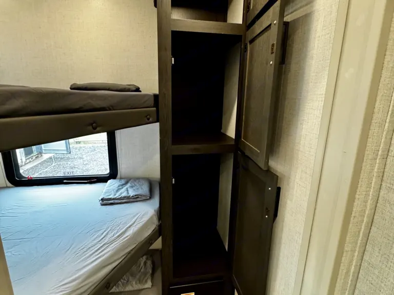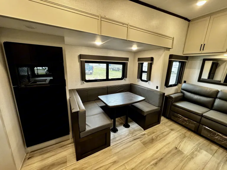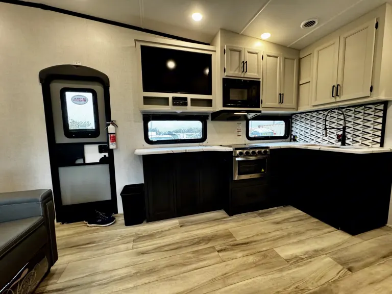 Living - Open-concept design seamlessly integrates the kitchen, dining, and living areas, making it ideal for families and entertaining, U-shaped dinette for lounging and additional sleeping space.Kitchen - under-mount stainless steel kitchen sink with a high-rise chef’s faucet and sprayer, Comes with a 12V, 10 cu ft solar-friendly refrigerator, 17-inch range with glass stovetop cover, and a microwave.Rooms - Front bedroom hosts a comfortable queen bed with under-bed storage, LED reading lights, dual nightstands, outlets with USB ports at the headboard, wardrobe space, and TV. The rear bunkhouse offers triple double-size bunks with storage wardrobes, ideal for families or guests.There is one full bathroom.
