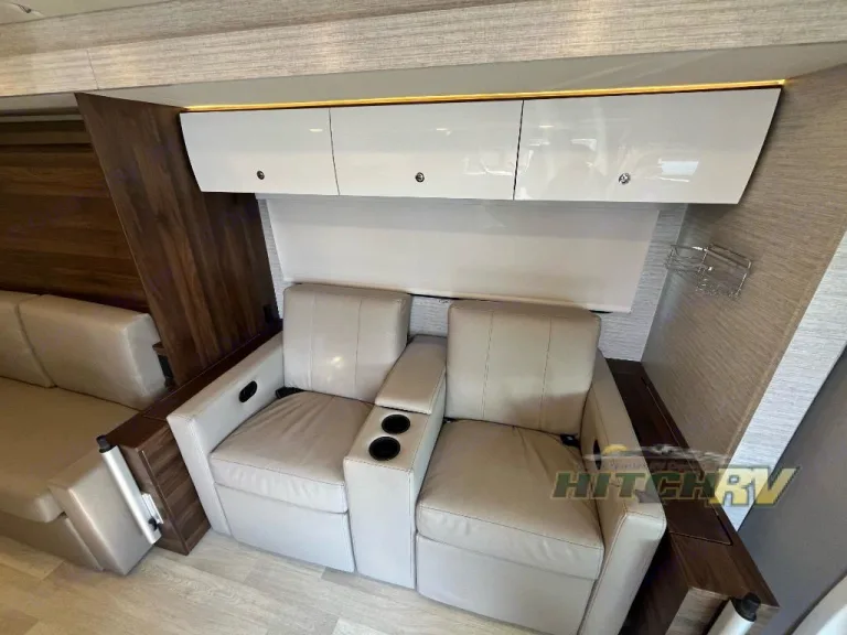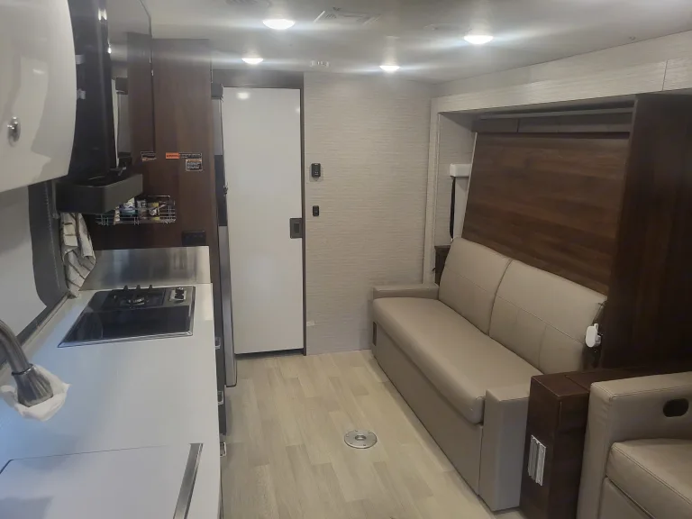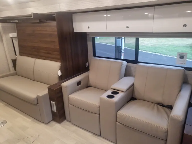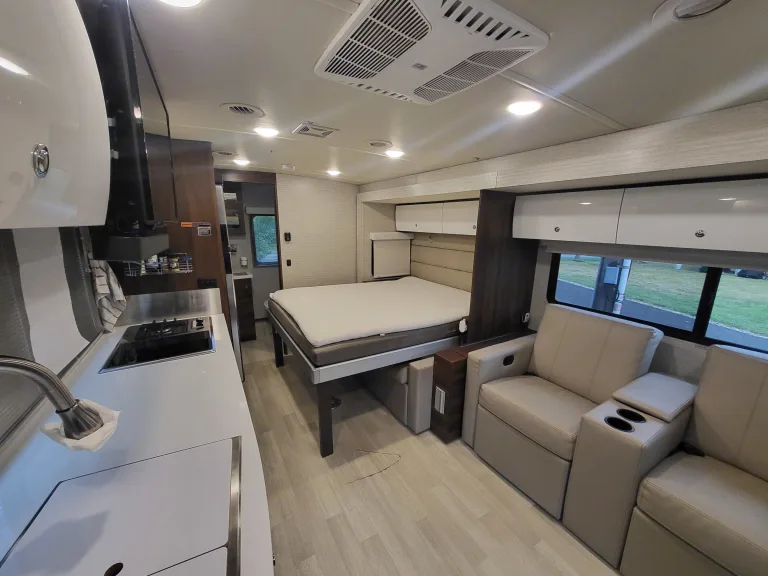 Bunk Over CabA couple or family will enjoy the look of the interior each time they take this View Class C diesel motorhome on the road. With the curved cabinets, the lighted soft-close galley drawers, and the sprung-cushion dinette and sofa seats, there will surely be a favorite feature for everyone. You will be able to easily set up the queen Murphy+ bed when it's time for bedtime while the kids sleep on the bunk above the cab. You will enjoy the theater seating option with swivel tables.