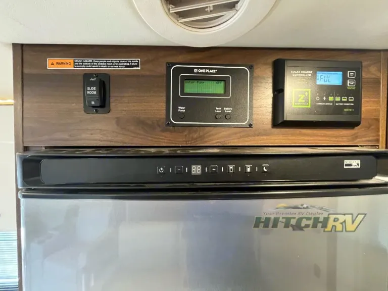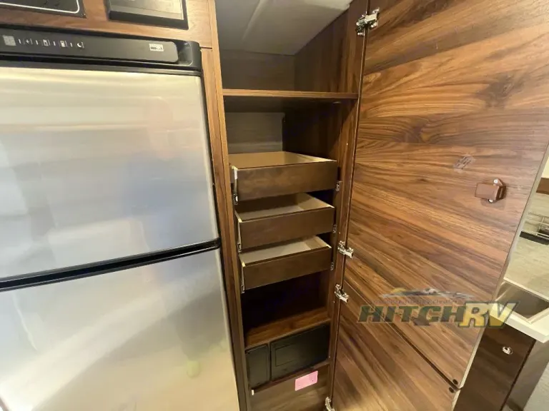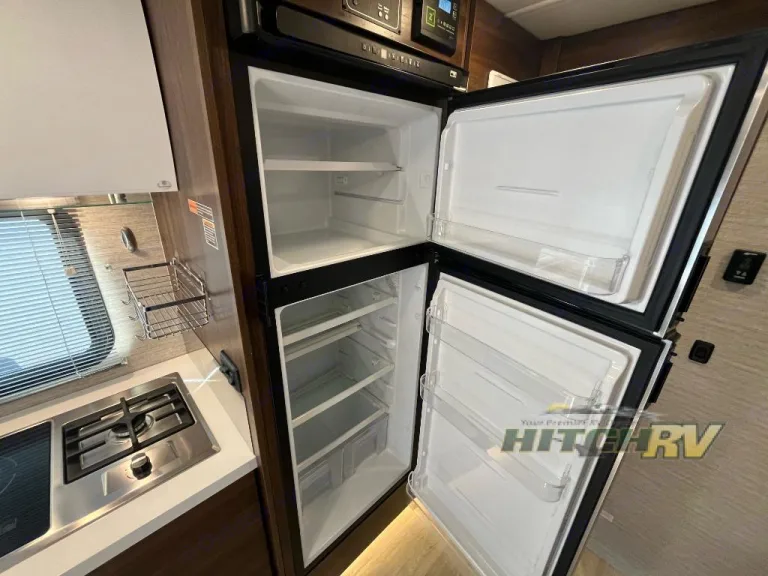 Everyone can get cleaned up in the full rear bathroom that has a space-saving sliding door before making meals with full kitchen amenities including a convection microwave/oven and induction and propane range.