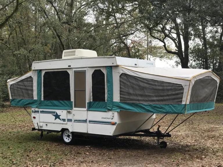 I have a 1994 Starcraft Starflyer Popup Camper. It’s in great condition especially considering the year. AC blows cold and is quiet. No refrigerator but there is an “icebox” (basically a built in cooler). Also has a propane stove and sink that can be slid through a built in compartment to be used outside. Seating area also converts into a bed. Canvas is in good shape with no tears and tires are in good shape. Very easy to pull and extremely light. Can be set up in little time. Camper has no leaks and is ready to go camping!