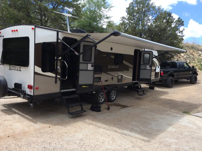 Hunting/Fishing/Camping in New Mexico? Look no further, this Kodiak travel trailer will make an excellent base camp for a great experience. This unit has a master bed room slide with a full sized queen bed, bathroom with an outside door! Rear living room slide that creates a lot of space for relaxing on the couch, watching TV in the either of the 2 recliners or entertaining in the kitchen area. Tons of pantry storage, did I say a bathroom and roomy shower. This unit also comes equipped with a solar panel and dual 31 batteries set-up for minimalistic dry camping and if you don't plan on running the A/C, microwave and/or TV then no generator or hook up is needed.Specifications
