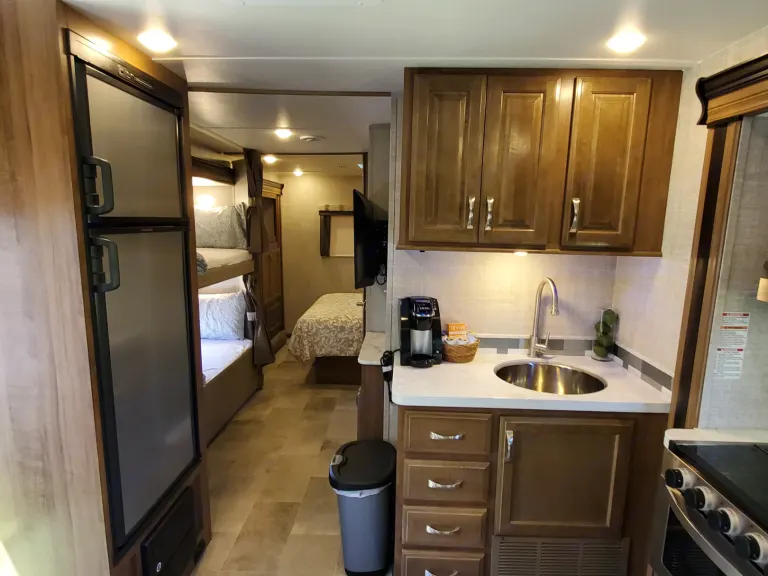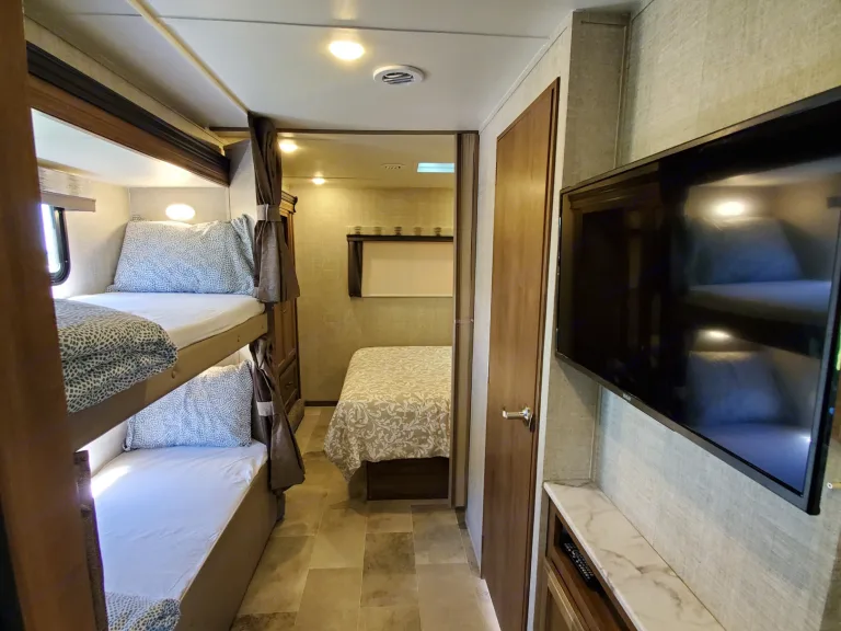Room to sleep 8 people with two huge slide outs. Two queen beds, two twin bunks and sofa converts into full size bed.All bedding, towels, dishes (for 8), essential cookware, toilet paper and cleaning supplies included. We even have a space saving highchair available upon request. Large refrigerator and freezer. Two flat screen televisions with Hdmi ports. New DVD player and a Roku so you can sign into your favorite streaming service where wifi is available.Awning with LED lights and outdoor speakers.Class C so it is very easy to drive.We've outfitted it with duvet style bedding that is washed between rentals. The mattress protectors, pillow protectors, duvet covers and duvets are all cleaned between each rental.We do ask that you return the RV as clean as when you received it. We wash all the linens and disinfect the home between rentals.Please feel free to ask any questions that you may have.