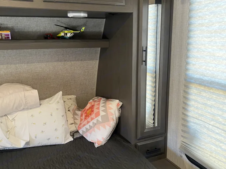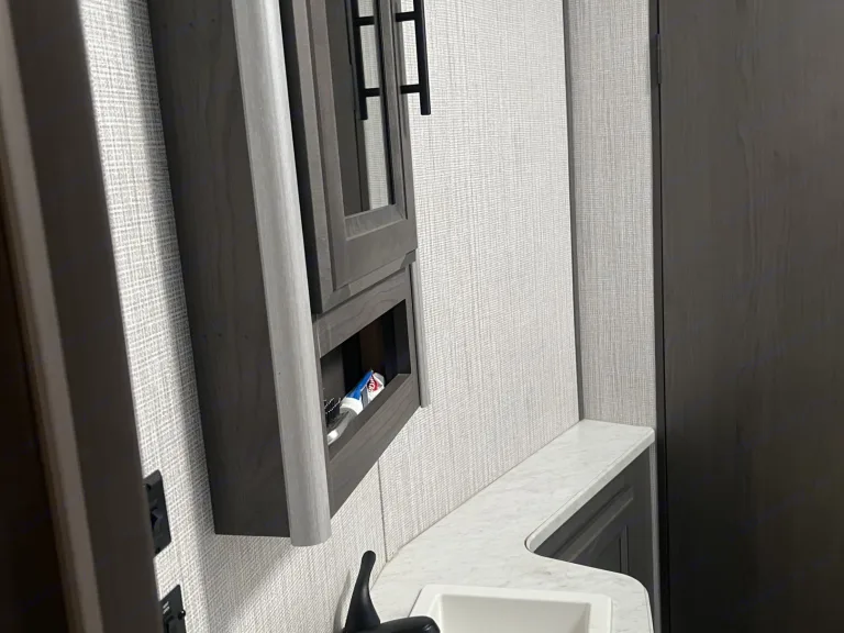 Enjoy the great outdoors by boondocking in the middle of nowhere or in a full hook up RV park. Either way, this unit has it all. Starting from the front is a king size bed with storage underneath where you’ll find camping chairs, camp chef with cast iron Dutch ovens and hoses for fresh water along with a bin for the sewer hose. On the other side is a 5500 watt generator that can easily power the whole unit! Next, is the bathroom with a toilet, sink, and shower. Shower does have hot water and a 60 gal grey water tank. In the kitchen is an oven, stove and sink. You’ll find cupboards for food storage along with pots and pans including a keurig coffee maker or stove top coffee maker depending on the experience you’re going for! Next to the sink is a table for 3 with a pull out couch. The couch and kitchen are part of this units only slide out. In the back of this toy hauler is two queen size bunk beds. When traveling, the bunk beds raise and create a 16 ft garage for your side by side, four wheeler or motorcycles, kayaks, paddle boards or whatever you wish to take along for your trip!What's included• camp chef w/ propane tank