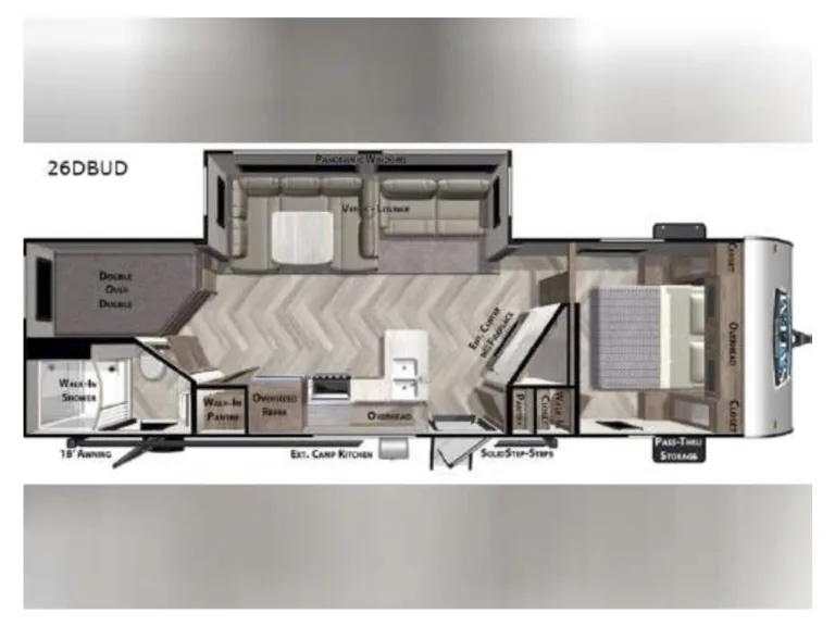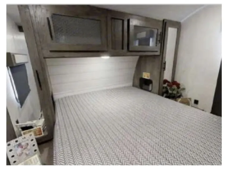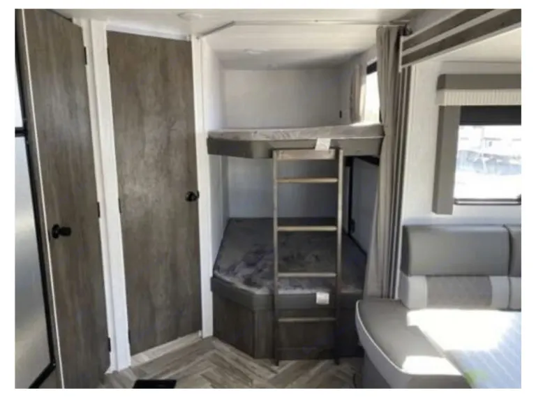 Master BR has mirrored wardrobe w/hangers and overhead storage. Closet and hamper, four 12" baskets and shoe storage under bed. USB & A/C outlets, blackout shades, and solid door for privacy. Bunk Room has USB & A/C outlets, cabinet storage, and TV. Stow-and-Go rear door for easy loading/unloading. Open living space converts to comfortable bed space.