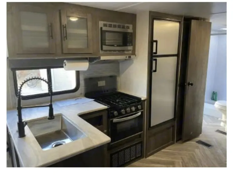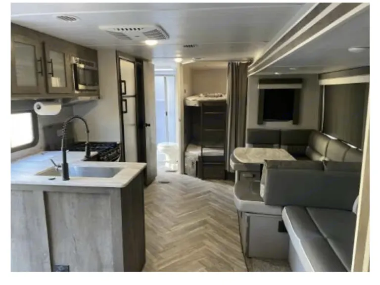Brand New! Luxury camping and room to gather all of your family and friends. Every upgrade and option.. step right in and immediately enjoy. Delivery service available. Comfortably sleeps 8: 2 in the private master queen, 2 in the double over double bunks, sofa lounger-turned-queen, and the Versa-Lounge that converts to sleep 4. Fireplace with programmable heat and lighting, customizable lounge and dinette seating, 39" smart TVs. Fully stocked kitchen, huge pantry, large slide-out for living area. Bathroom with shower.